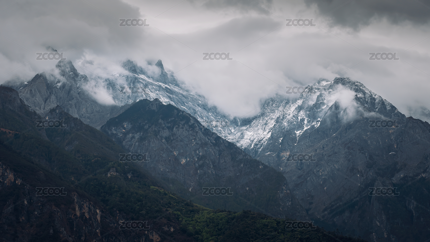 中国云南玉龙雪山在烟云缭绕中挺立