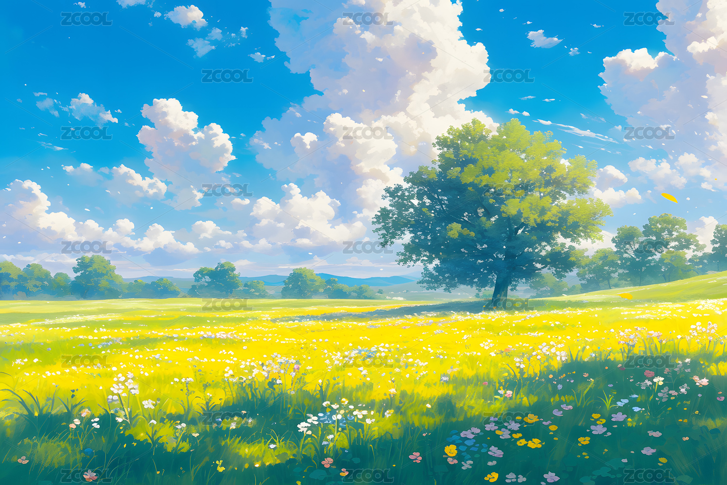 蓝天白云草地鲜花户外场景壁纸