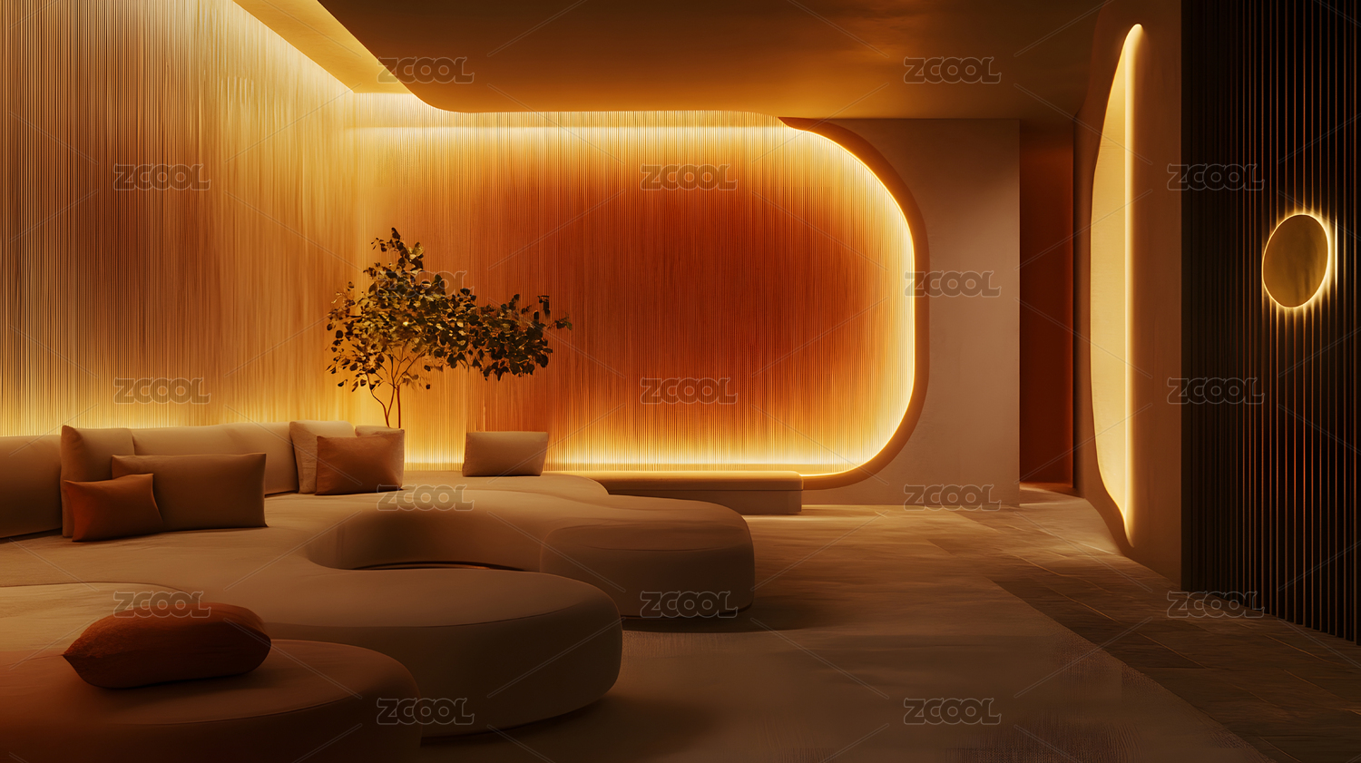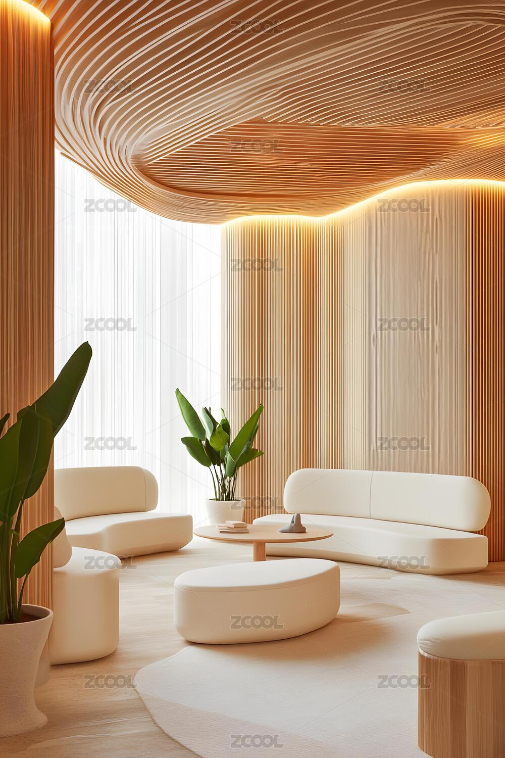 温暖现代休闲空间:曲线木墙与舒适座椅
