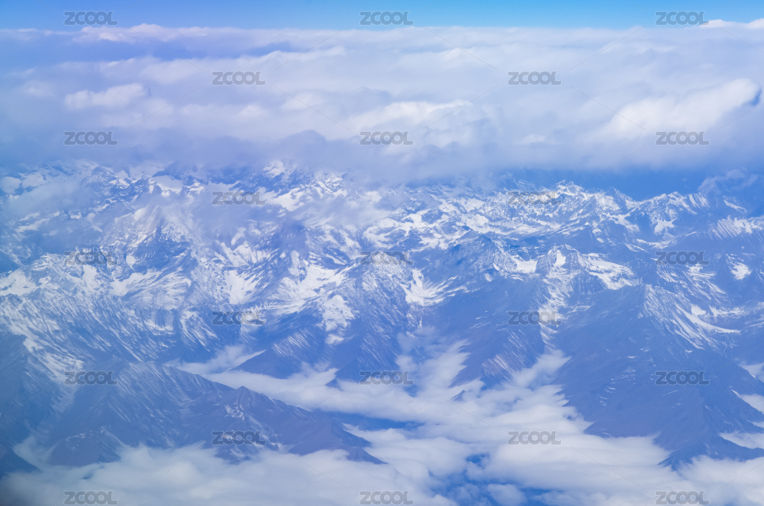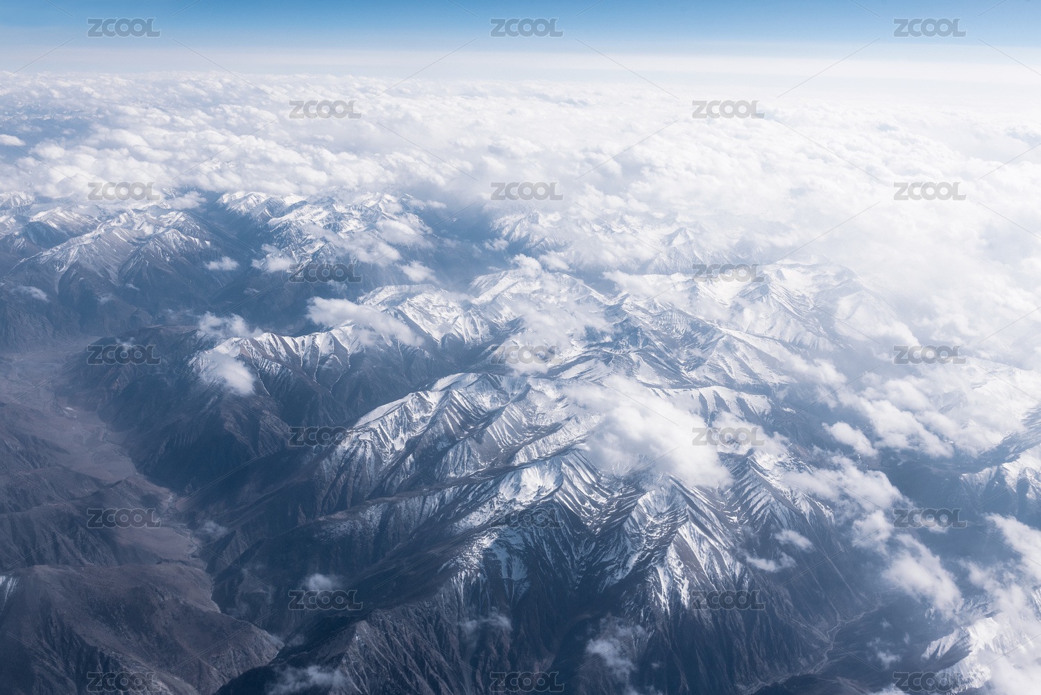 俯拍中国新疆地区云雾缭绕的雪山风景