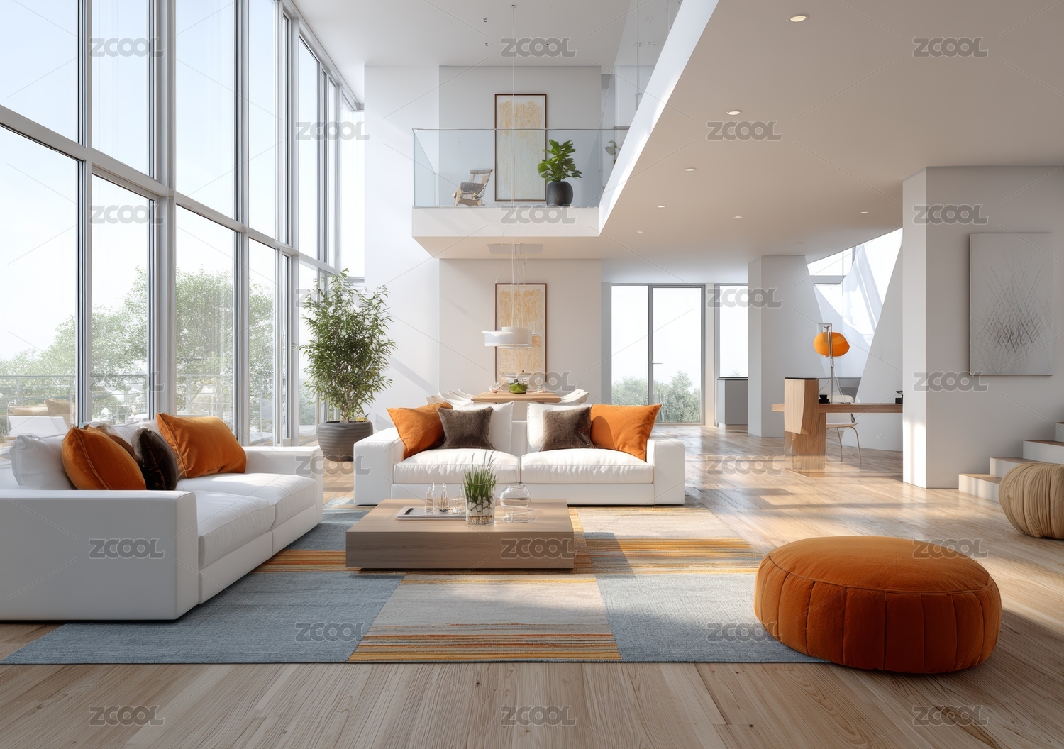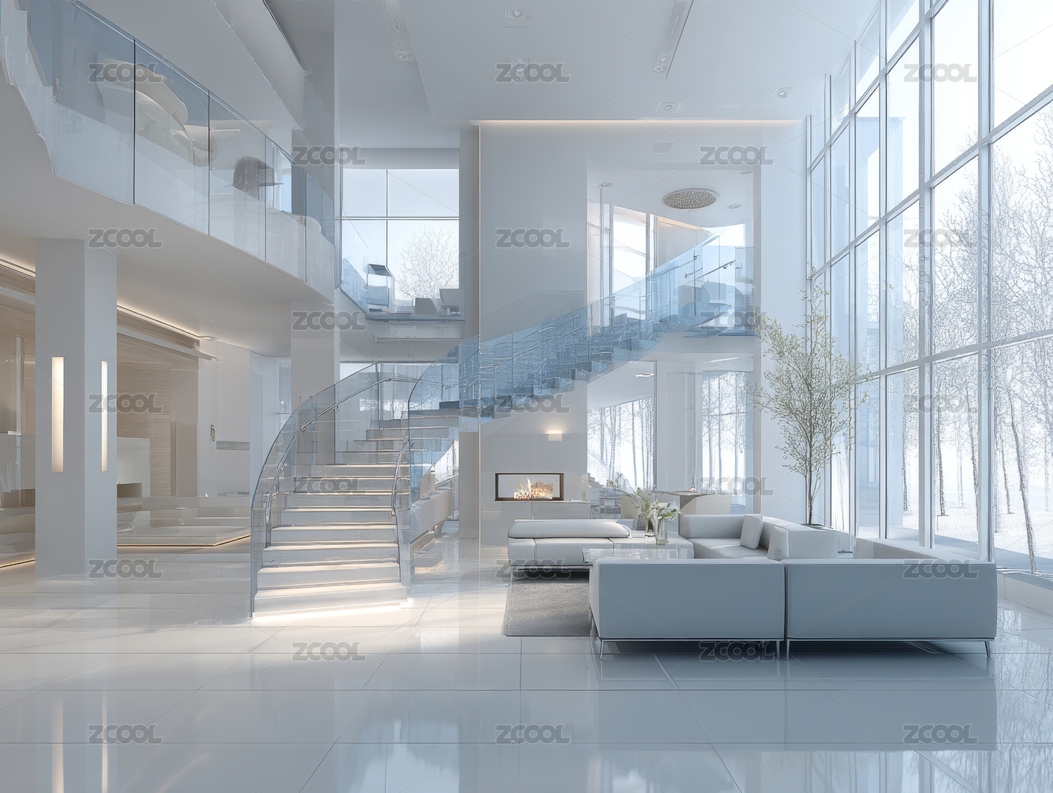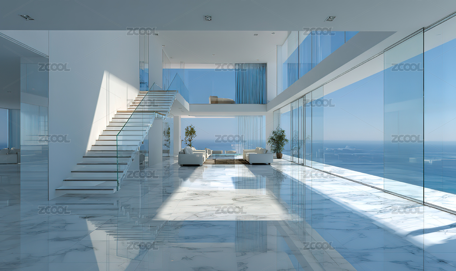 落地窗建筑内部大理石展厅带办公桌沙发窗外