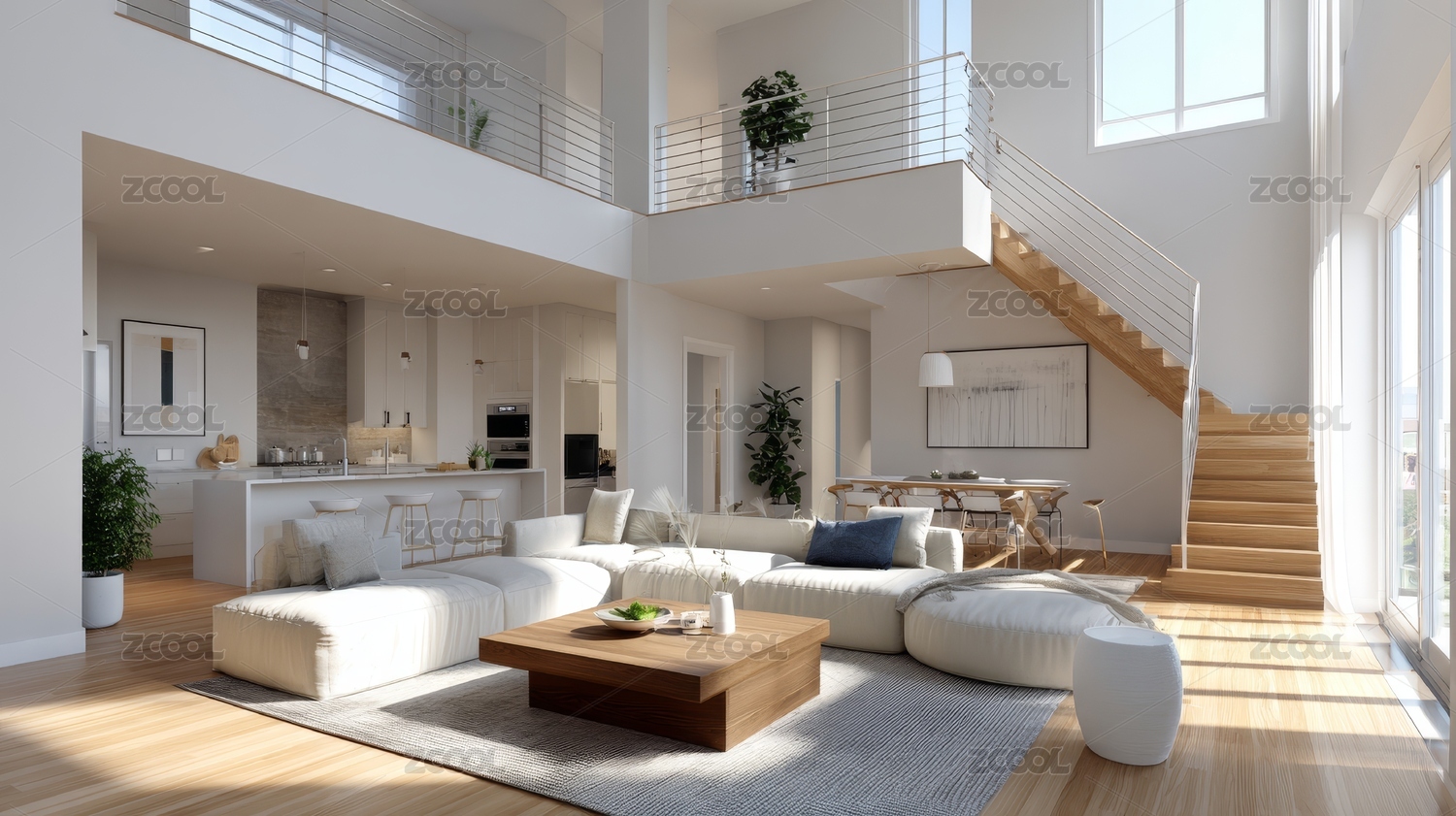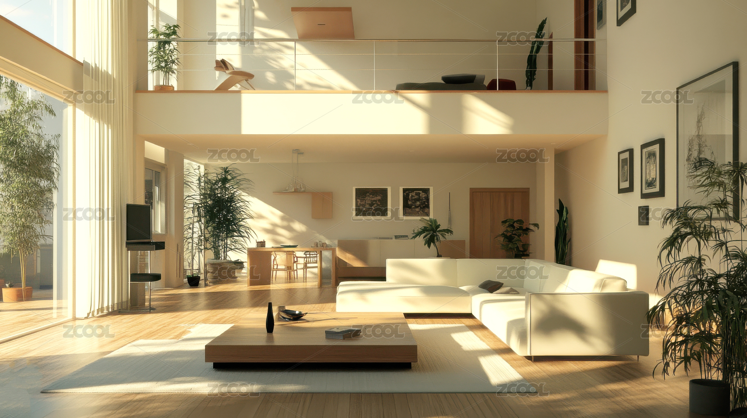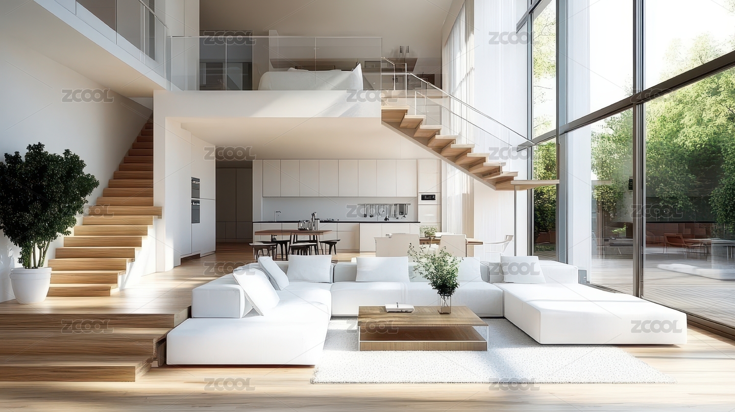 落地窗建筑内部大理石展厅带办公桌沙发窗外