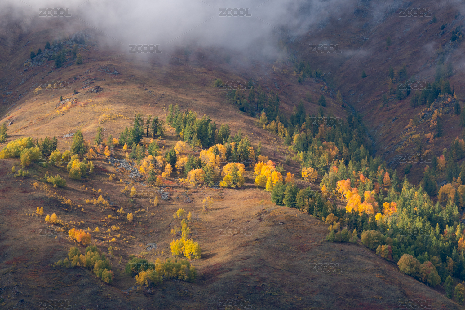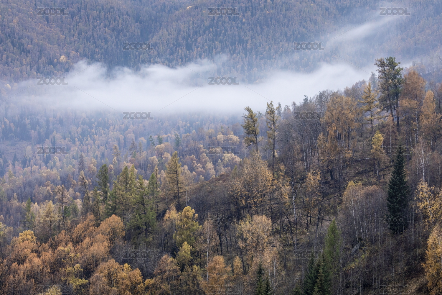 秋天,云雾缭绕的中国新疆阿尔泰山