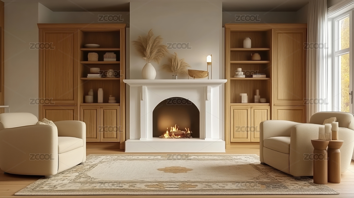 白色L形沙发,白色毛毯,抱枕,圆形小木桌,陶瓷花瓶,装饰品,壁炉,柴火,白色,浅米色