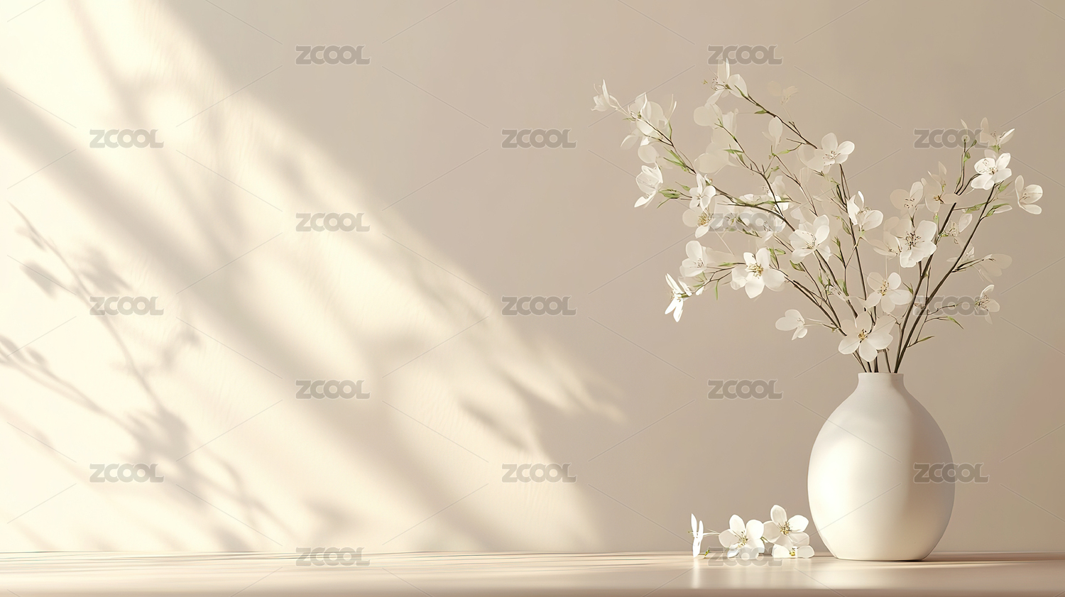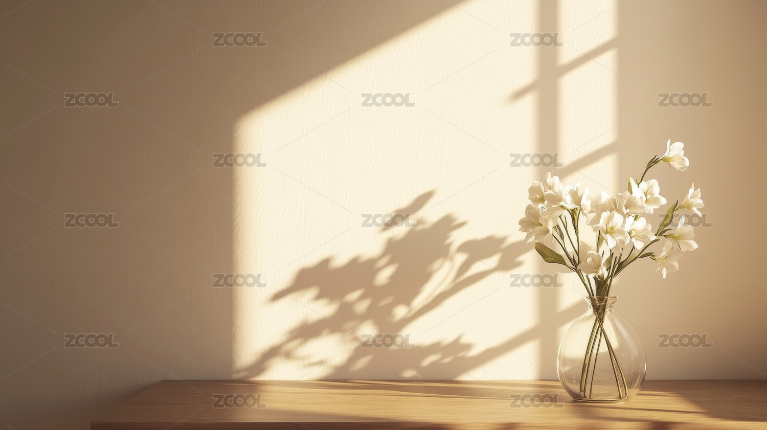 白色花朵,优雅,简约风格,小花瓶,花瓶,浅色,淡黄色桌布,背景,墙,窗户