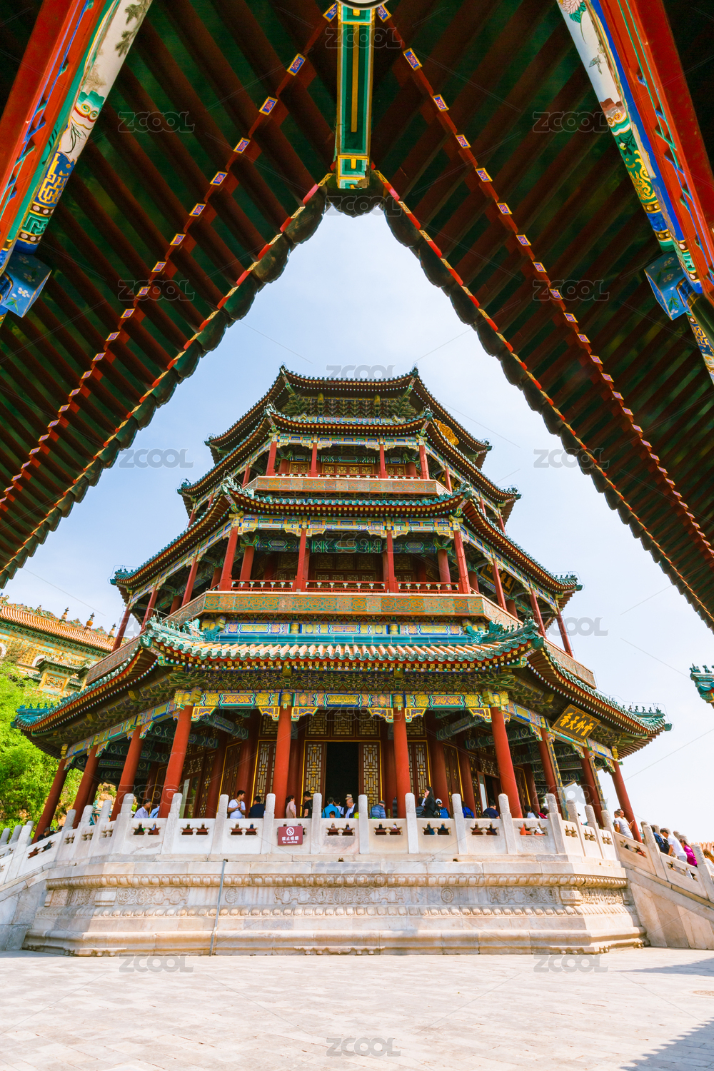 北京夏季颐和园公园亭子低角度拍摄