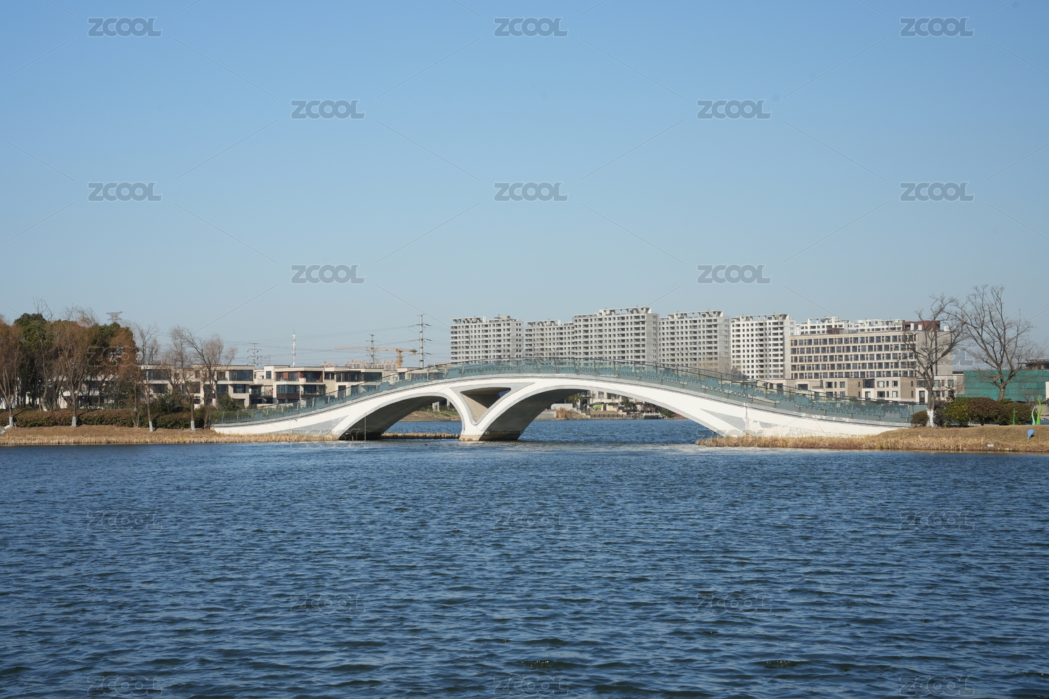 苏州,昆山,玉湖公园,湖面,白桥,桥,建筑,冬日,树,草地