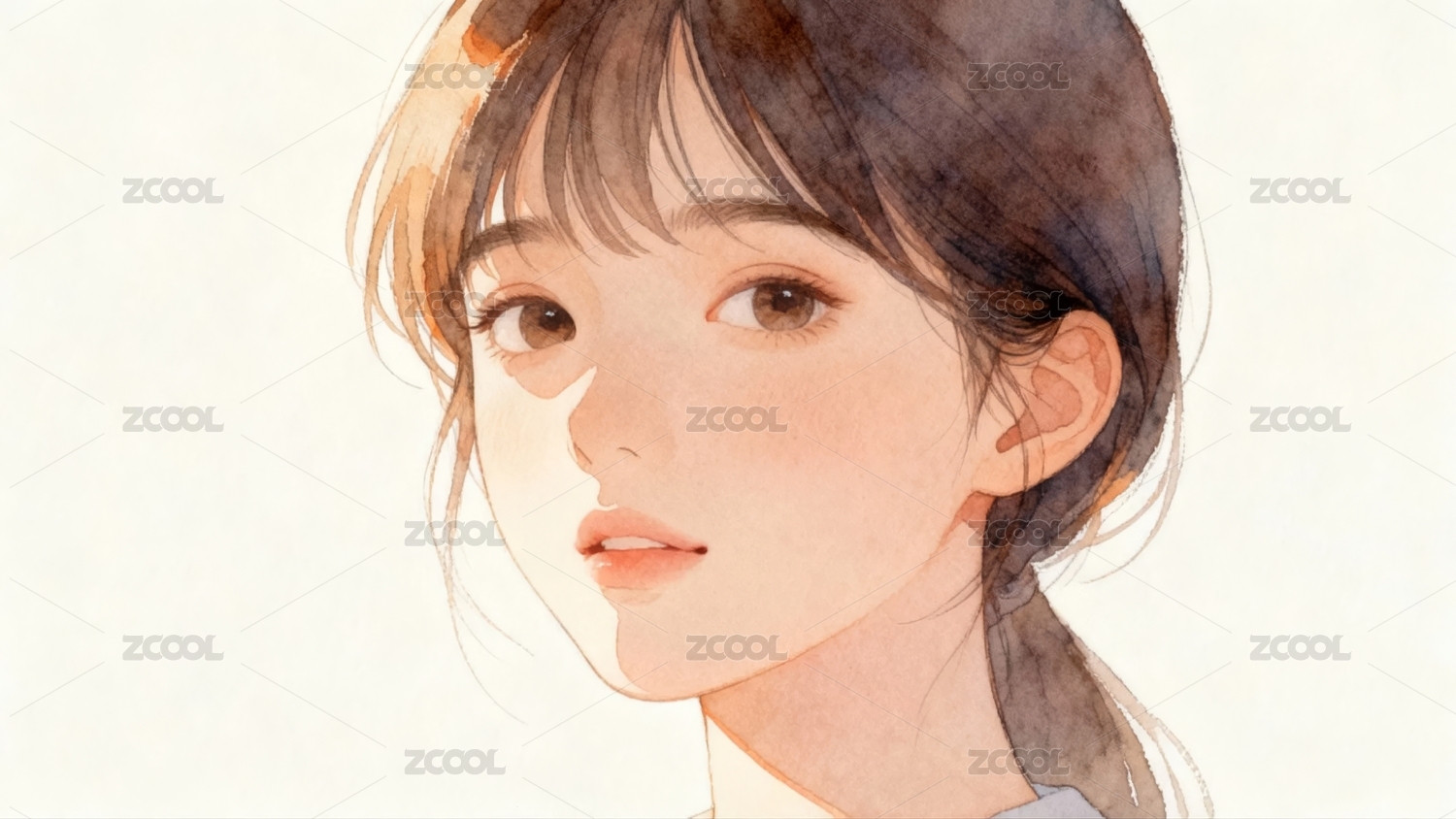 少女侧脸水彩肖像