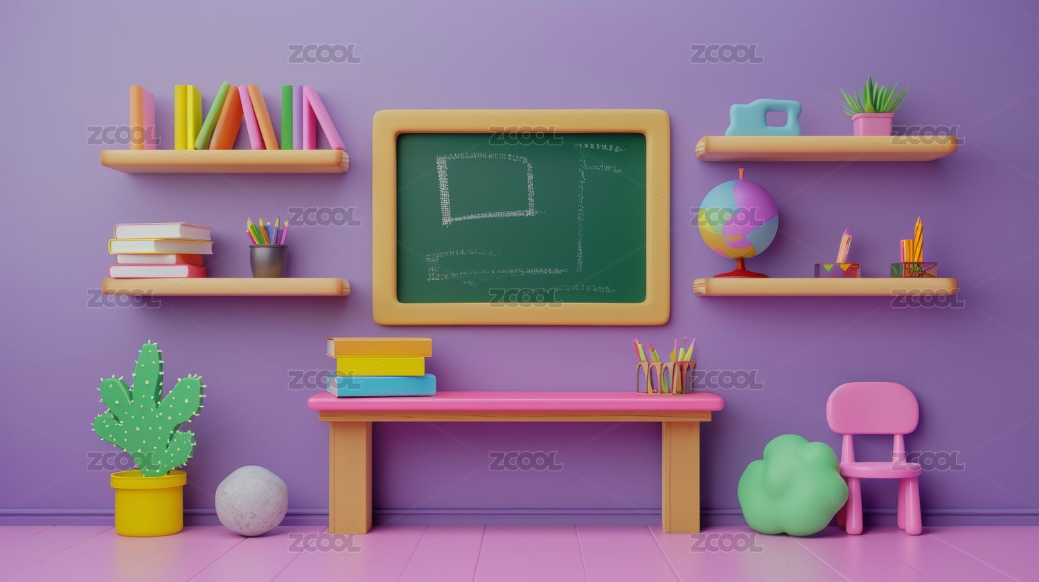 卡通明亮教室里的课桌椅