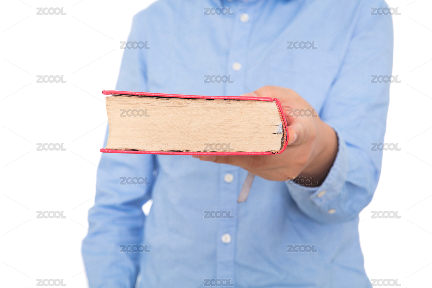 蓝色衬衣男士手里拿着一本书特写