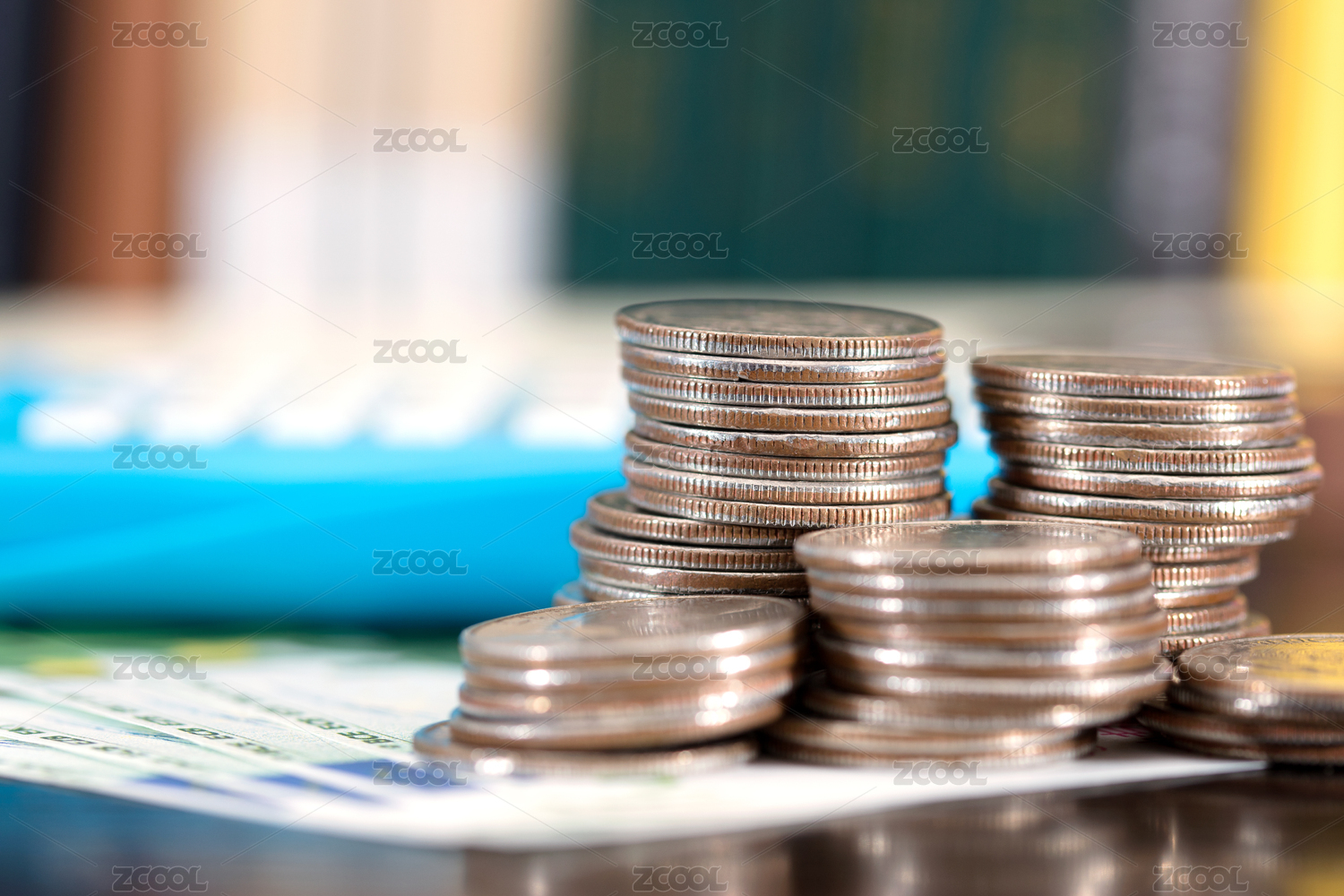 打开的笔记本和硬币及玻璃瓶里装着的一些硬