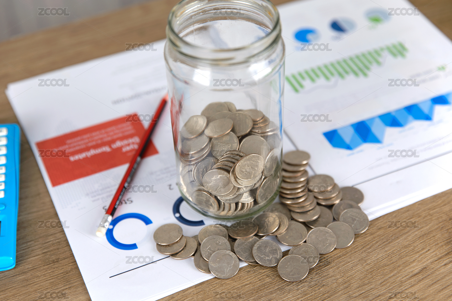 玻璃存钱罐在金融资料上和一堆美元硬币