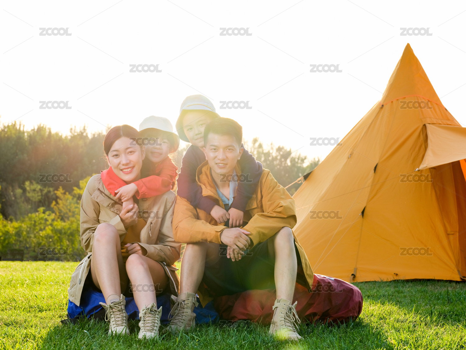 快乐的四口之家在户外合影