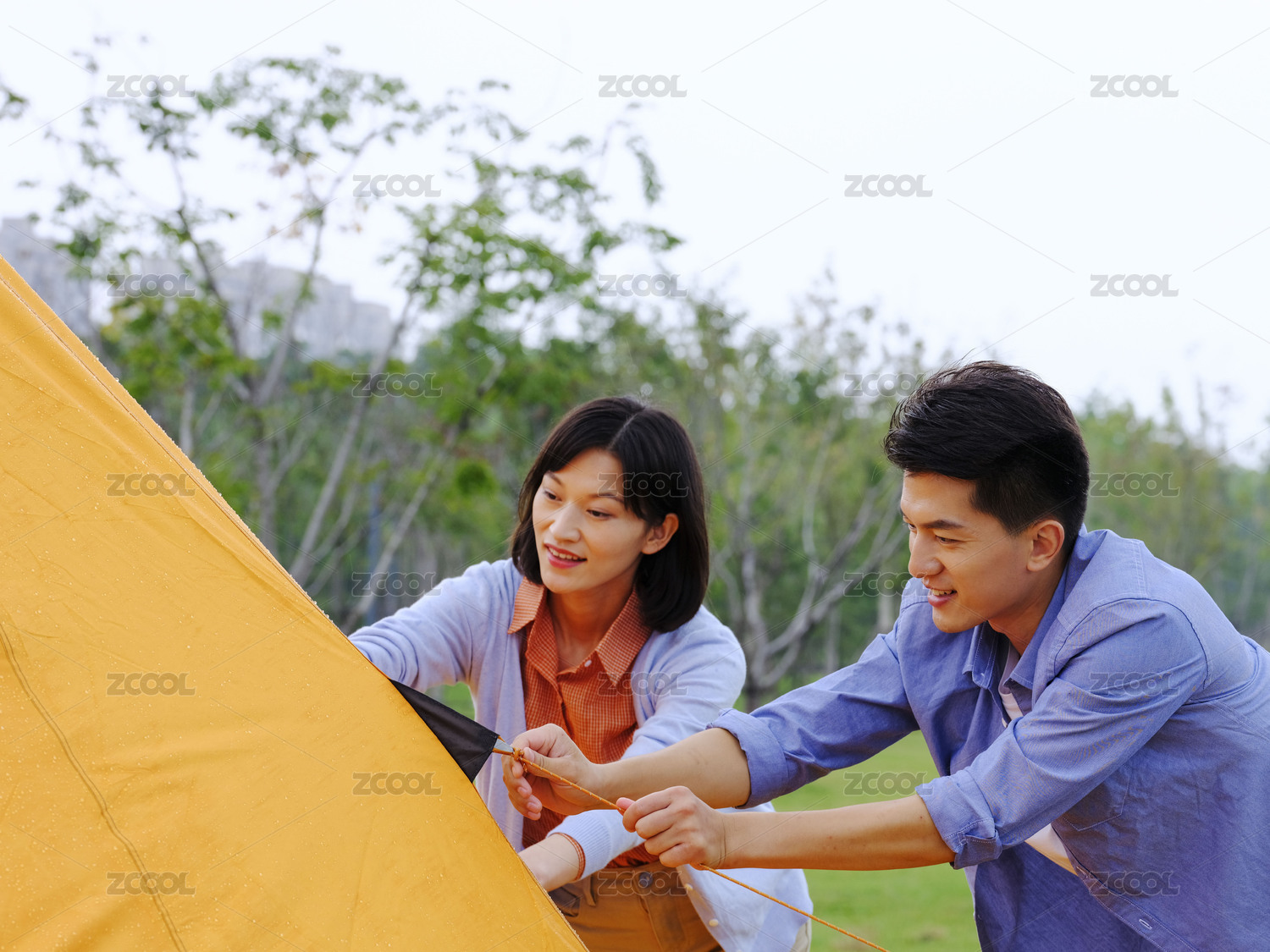 年轻情侣在户外搭帐篷