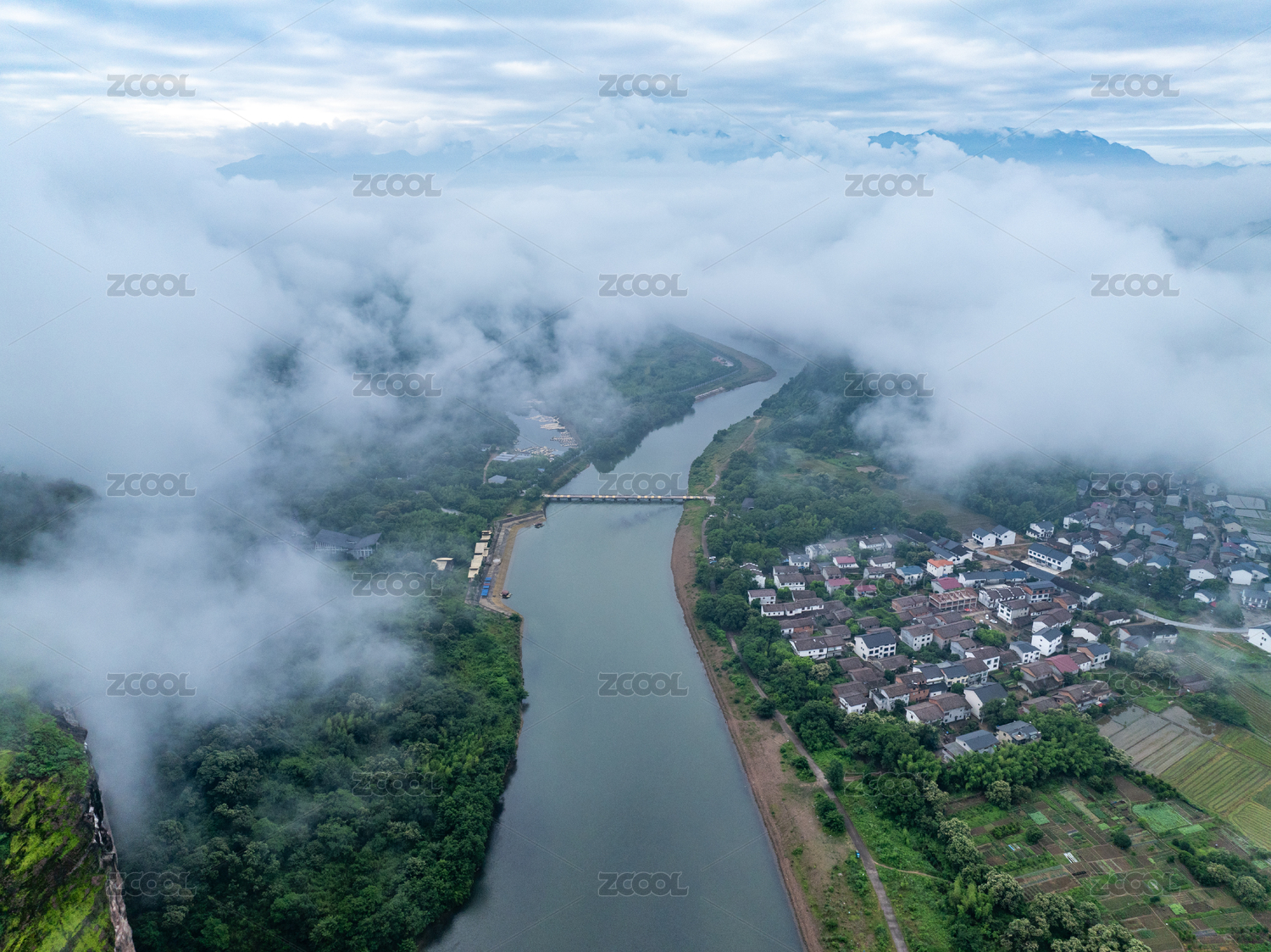 航拍美丽乡村农村山村河流云雾缭绕景象