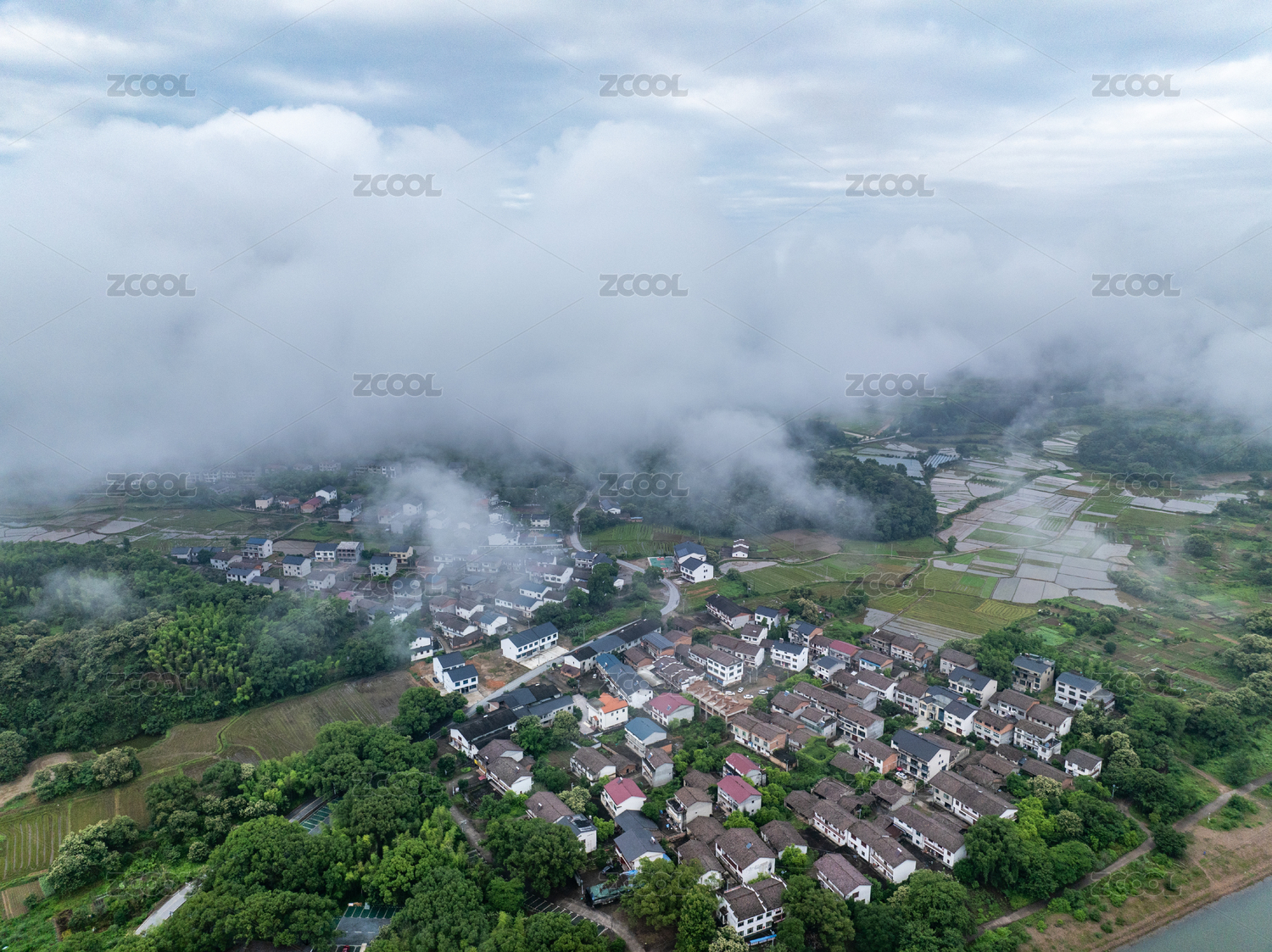 中国浙江丽水缙云仙都烟雨朦胧田园风光