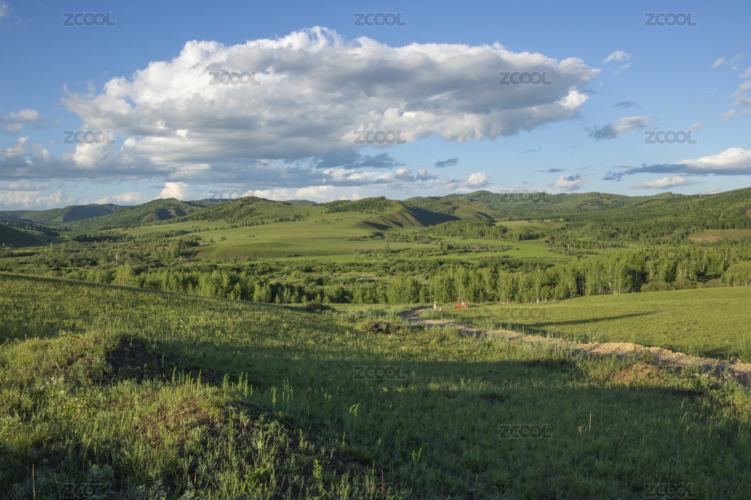 中国内蒙古赤峰桦木沟林场景区山地草原蓝天白云