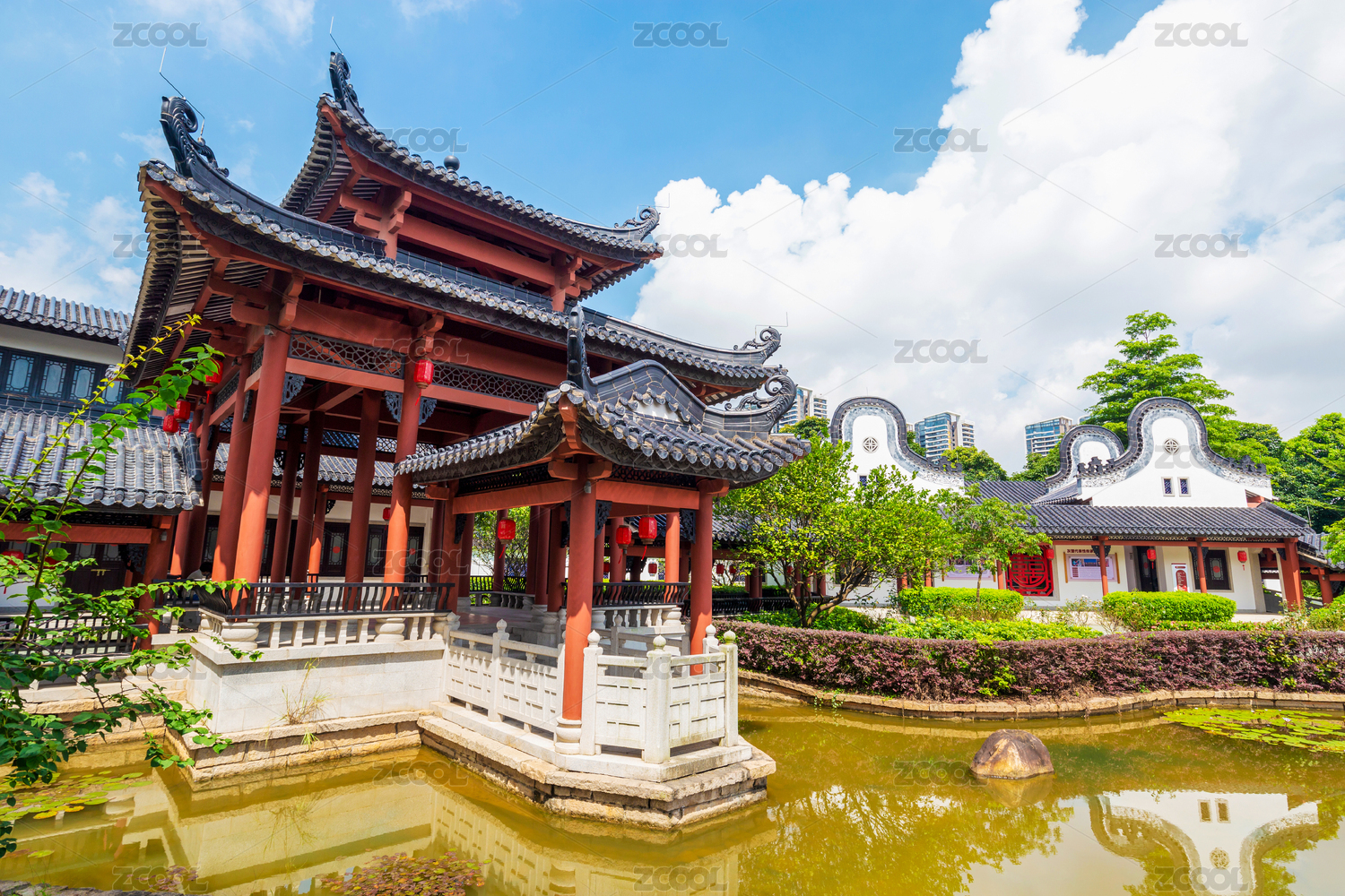 春天广东广州文化馆滨水的亭台楼阁风光倒影