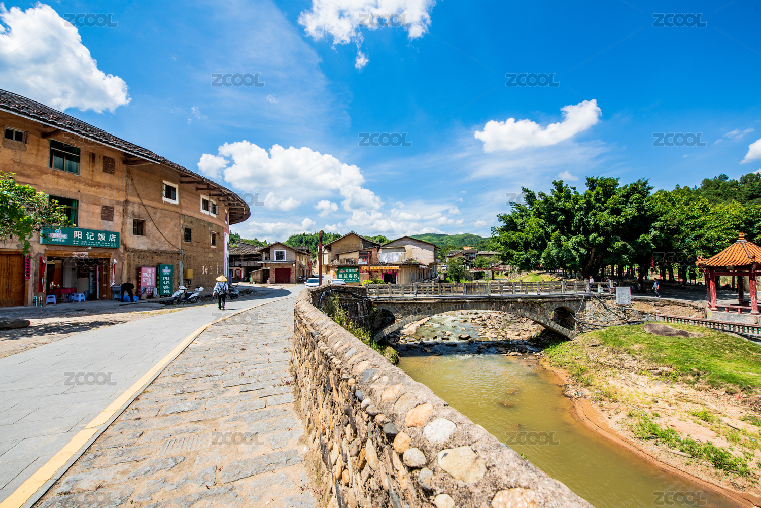 福建,龙岩,永定区,洪坑村,洪坑土楼,夏天,晴天,多云,蓝天,河流