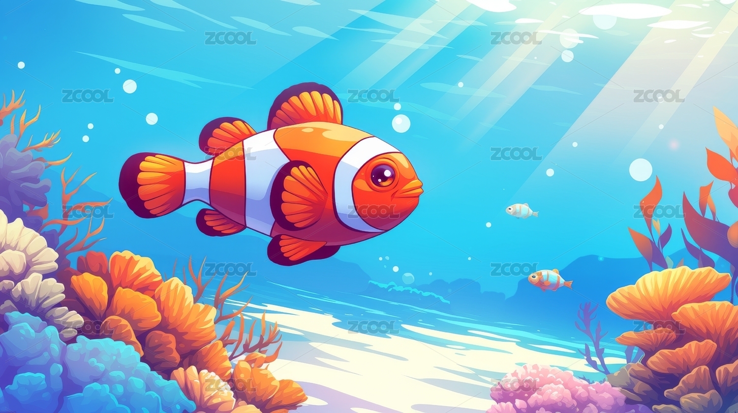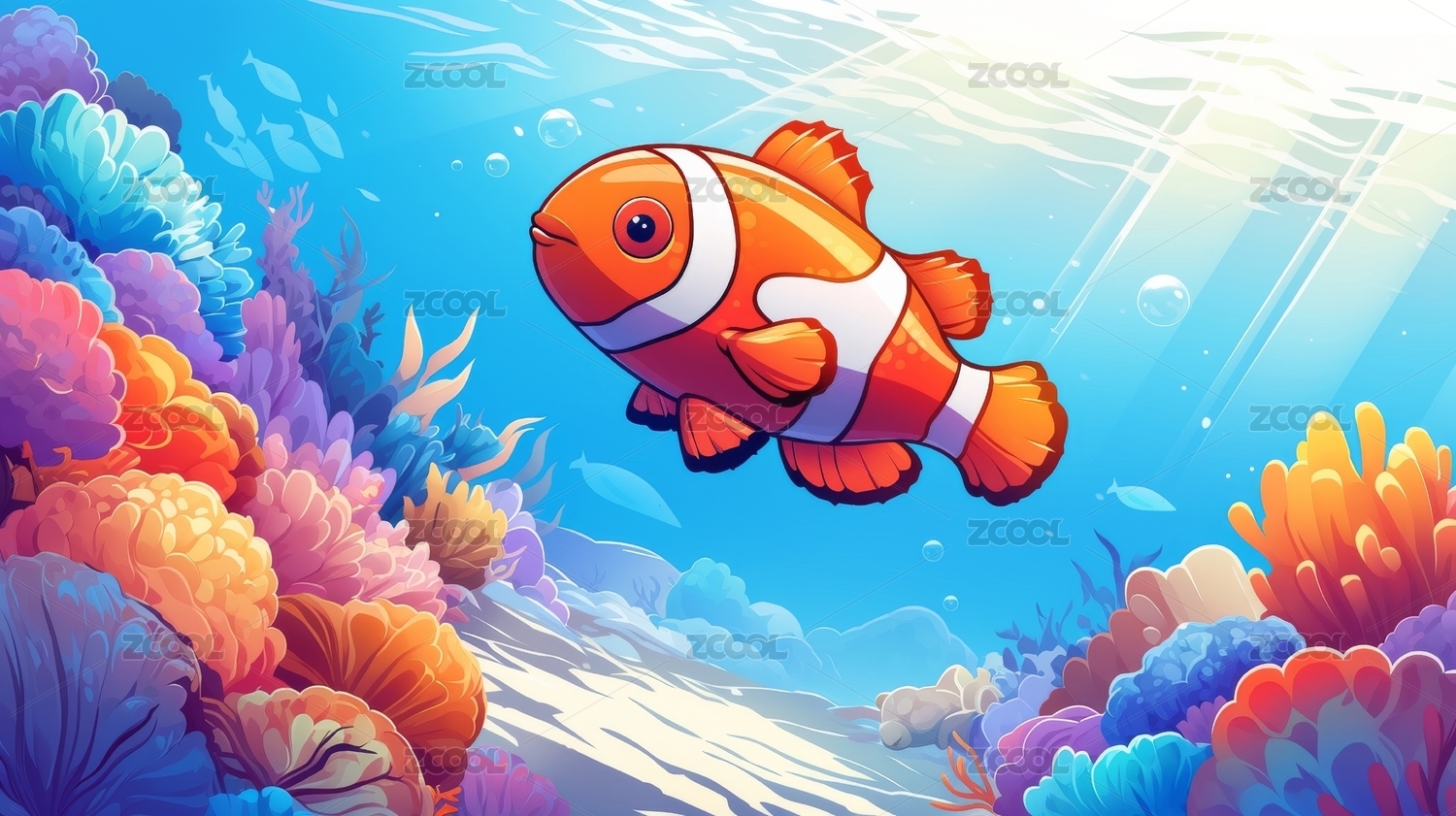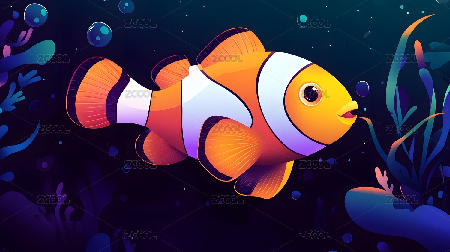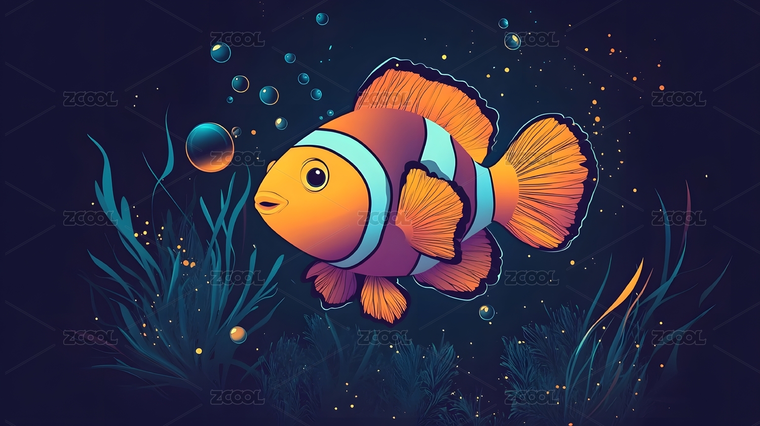夜幕下珊瑚丛中可爱的卡通小丑鱼