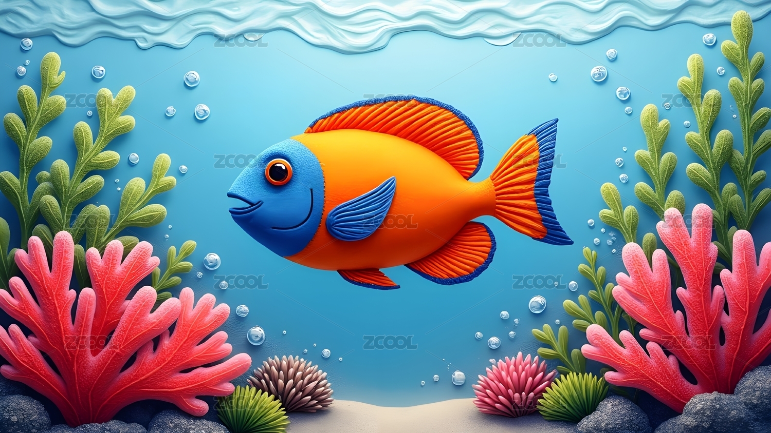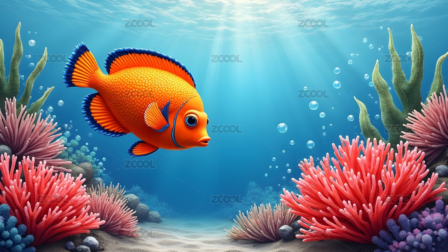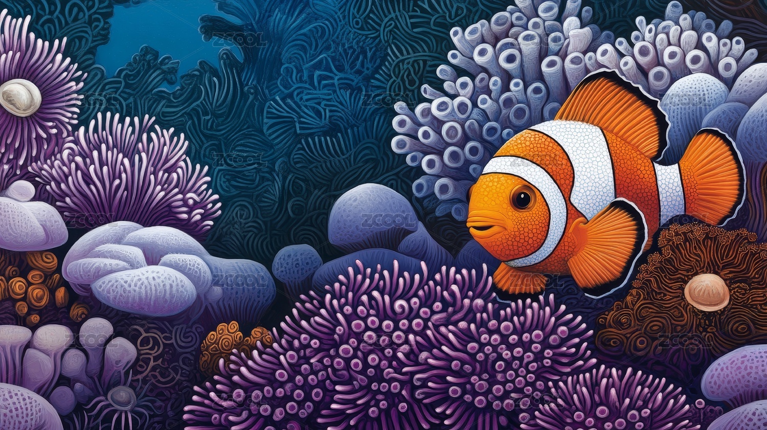 三维,立体,3D,插画,背景,壁纸,海洋,鱼类,小丑鱼,珊瑚
