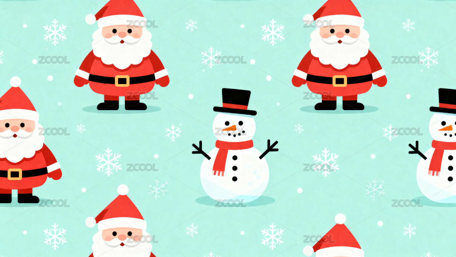 四方连续手绘圣诞雪人圣诞树雪花绿色背景