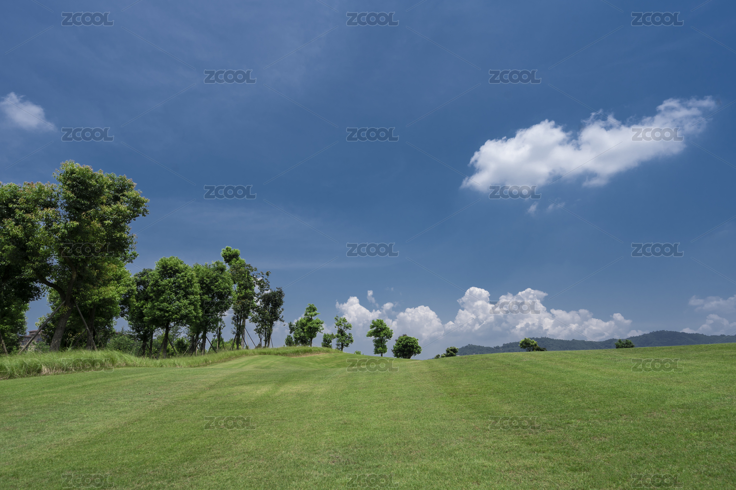 蔚蓝天空下的草地和参天大树