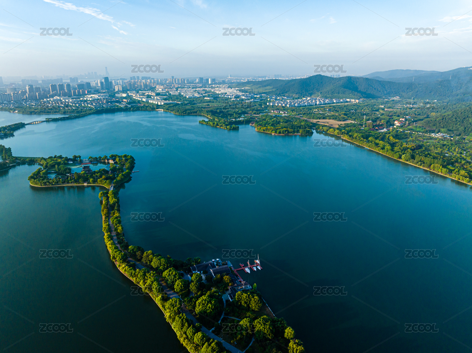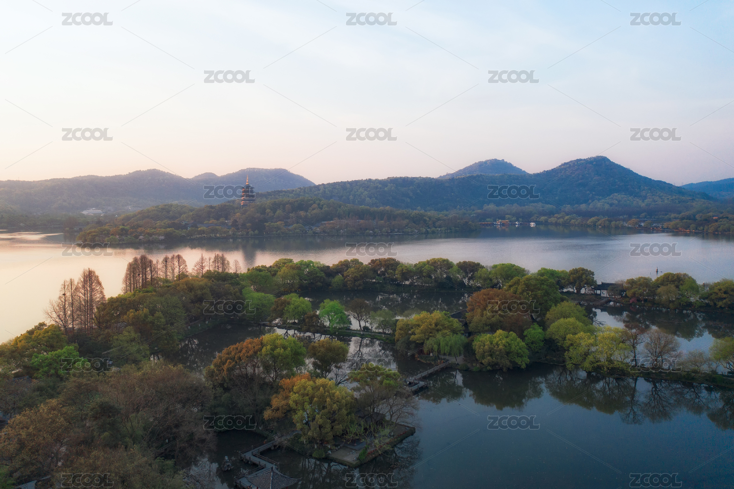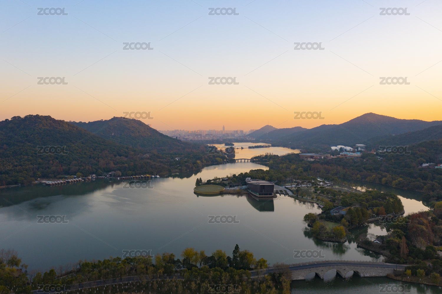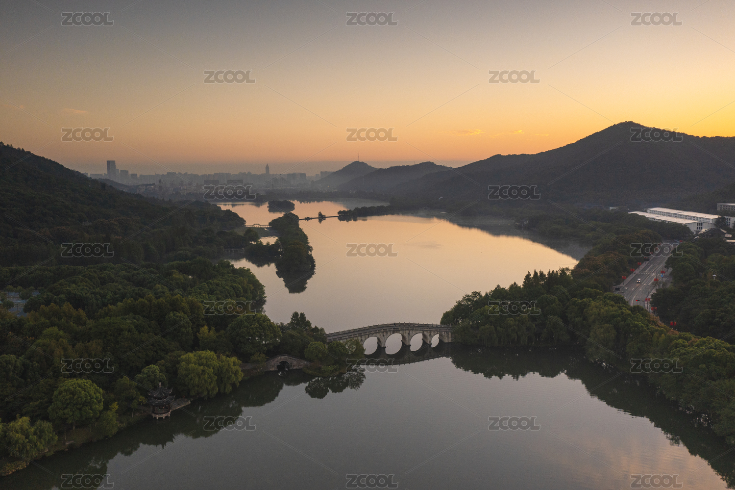 浙江省杭州市湘湖景区秋色晨曦航拍