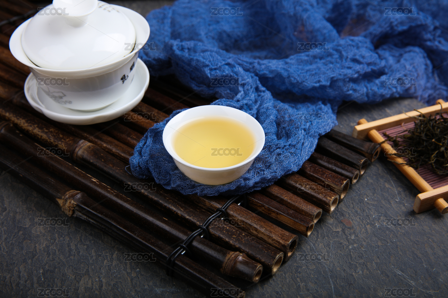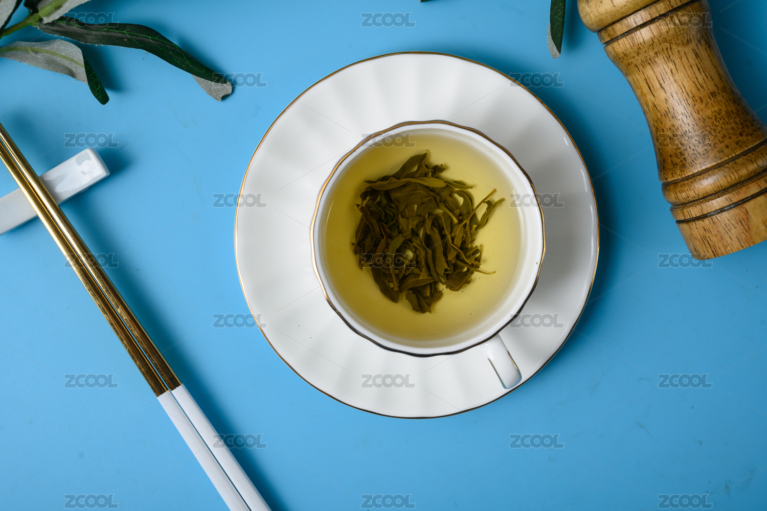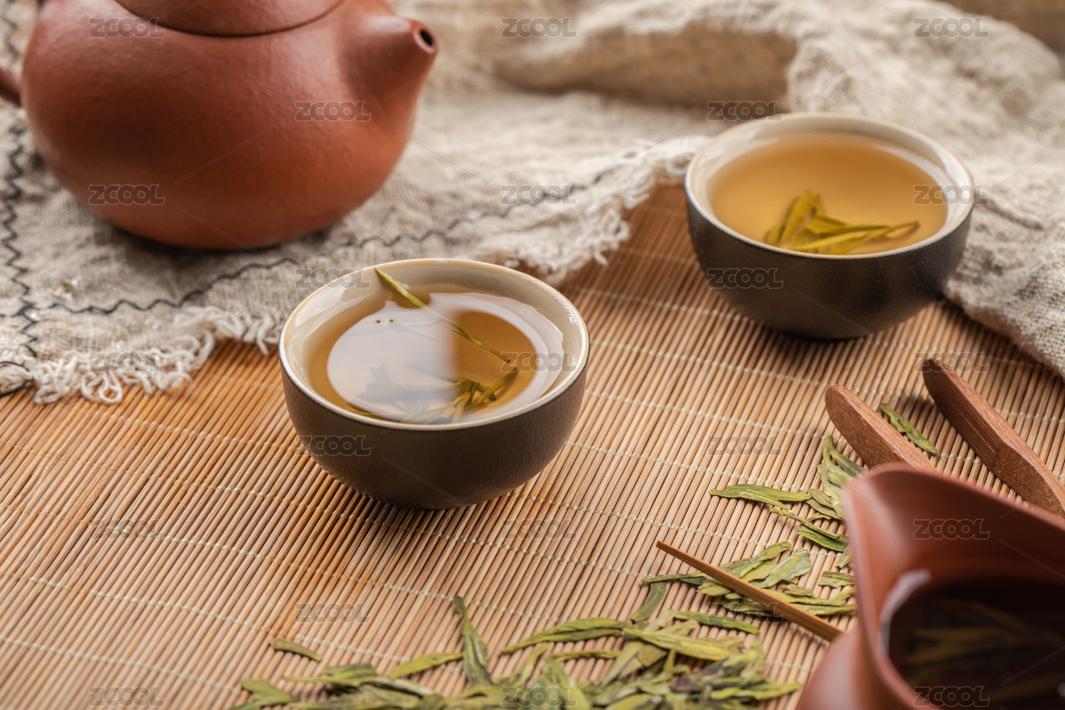 汝瓷茶具冲泡的绿茶西湖龙井摆放在绿背景上