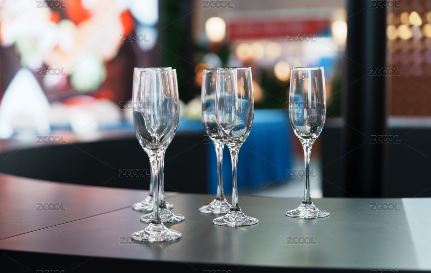 吧台上的空香槟杯排列