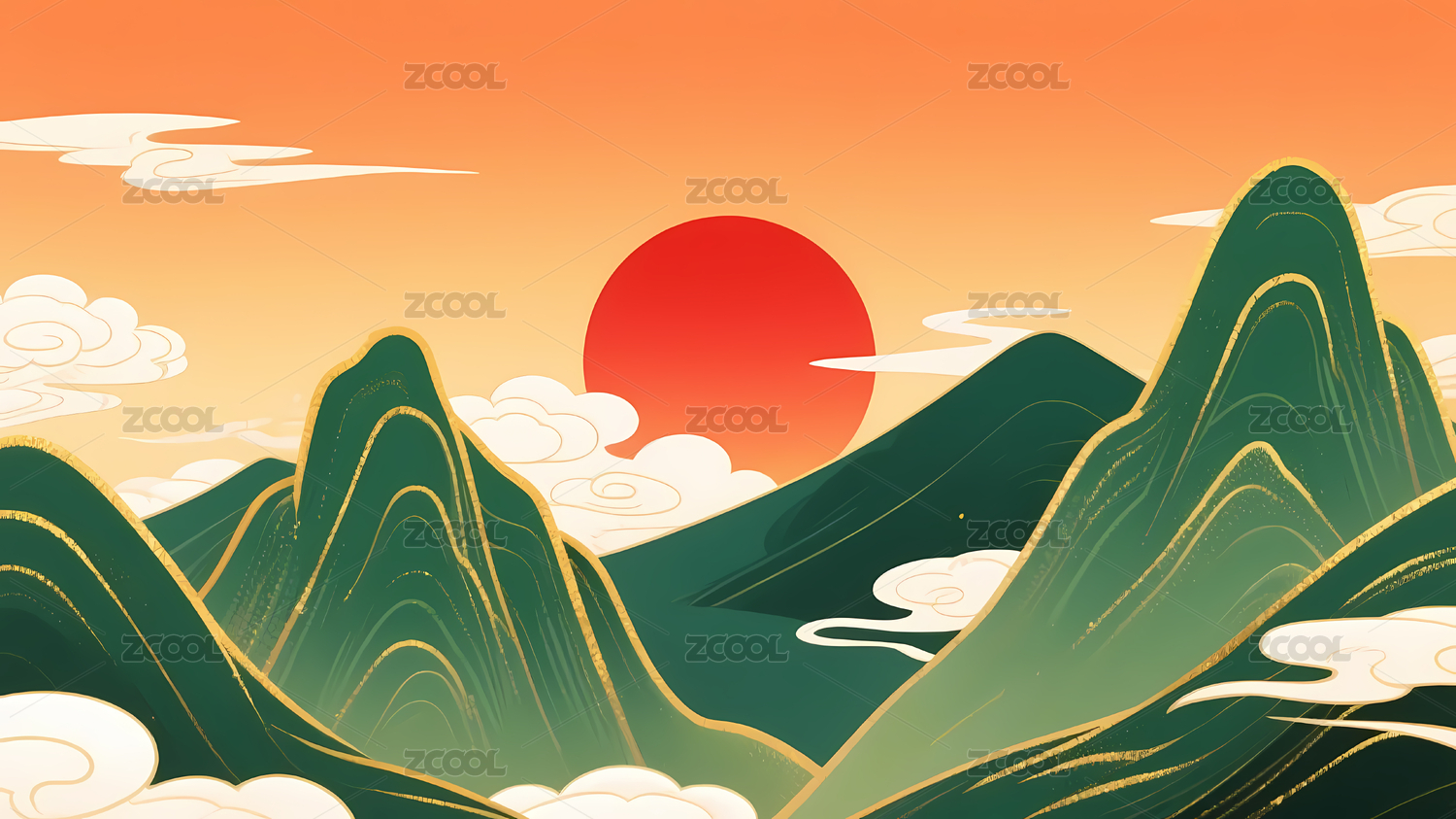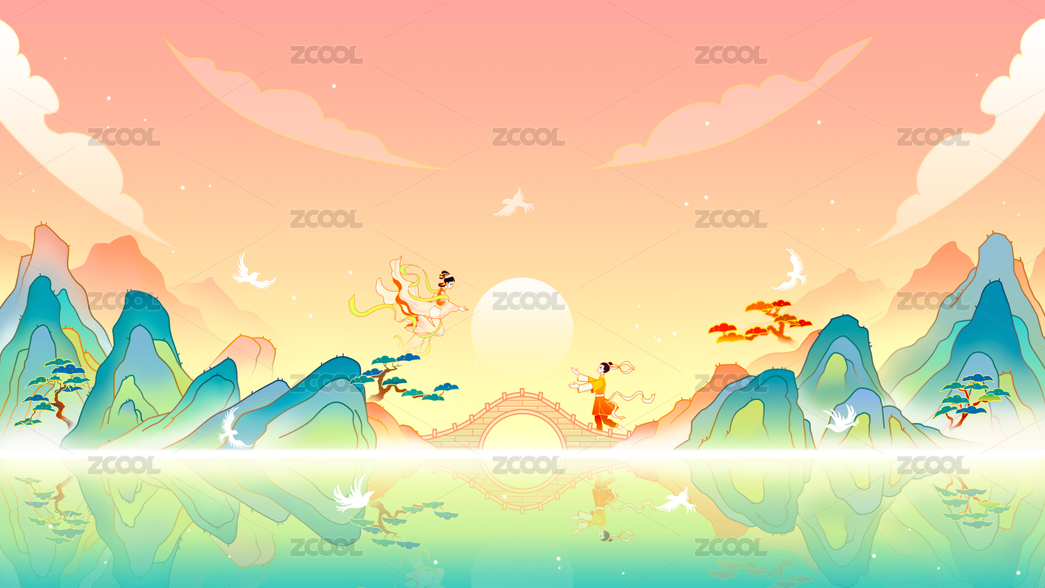 仙鹤在山水祥云间飞翔风景国潮矢量插画