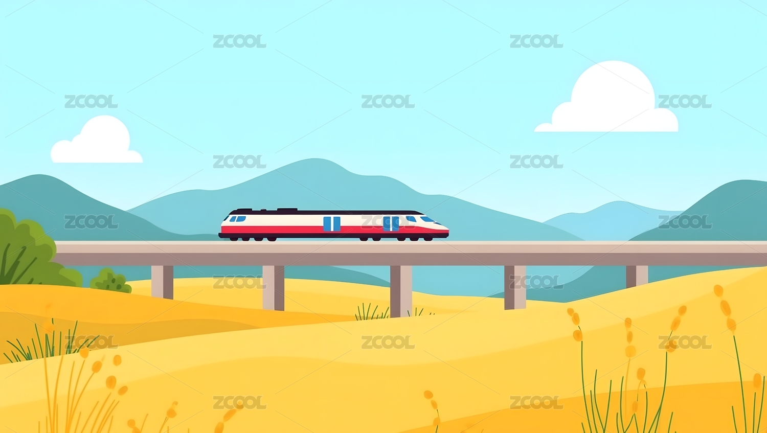 一列红色的火车从山谷间疾驰而过的插画背景素材