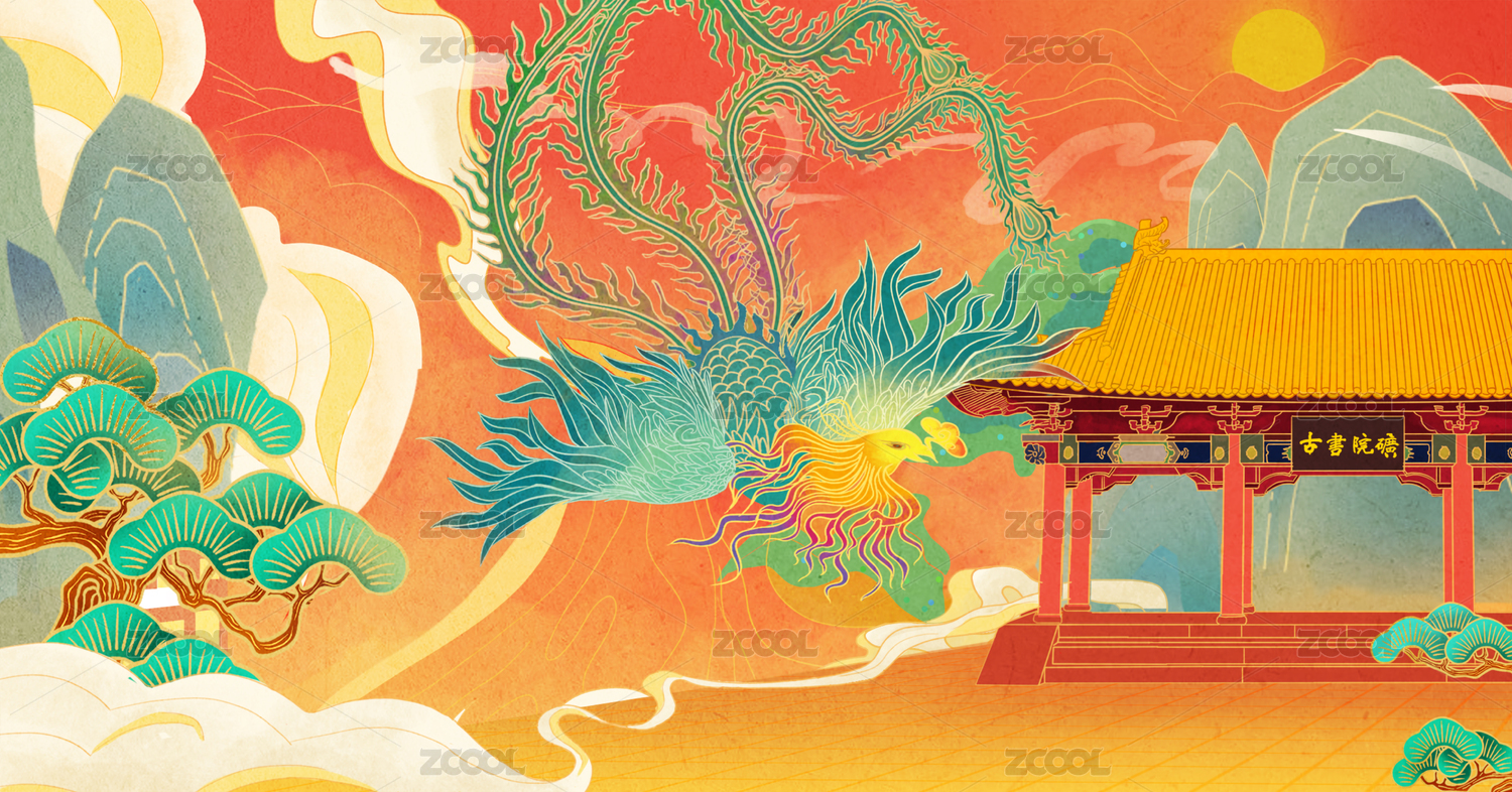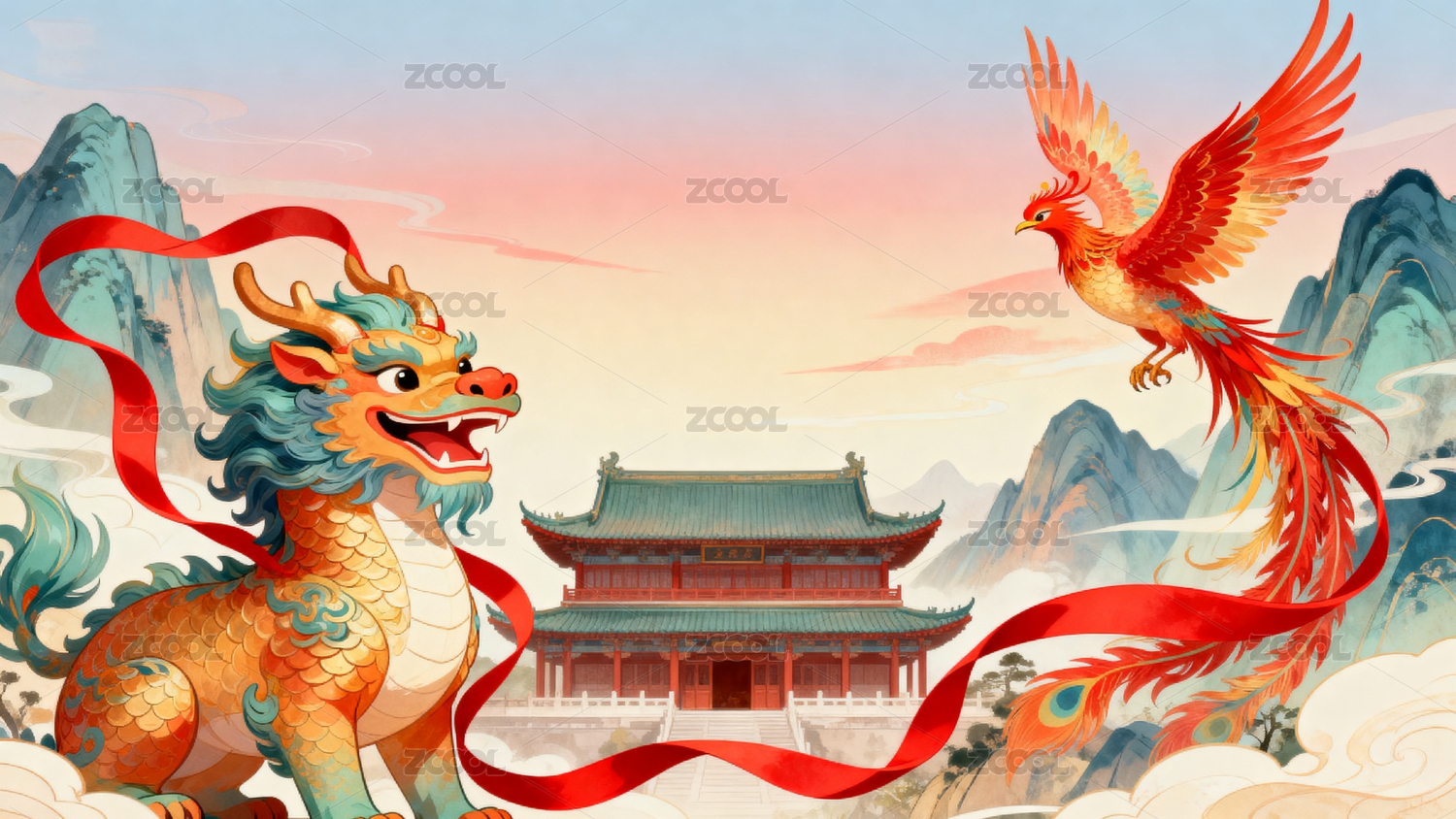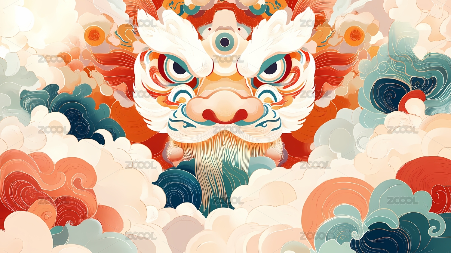 喜迎新春新年喜庆舞狮龙飞凤舞国风插画