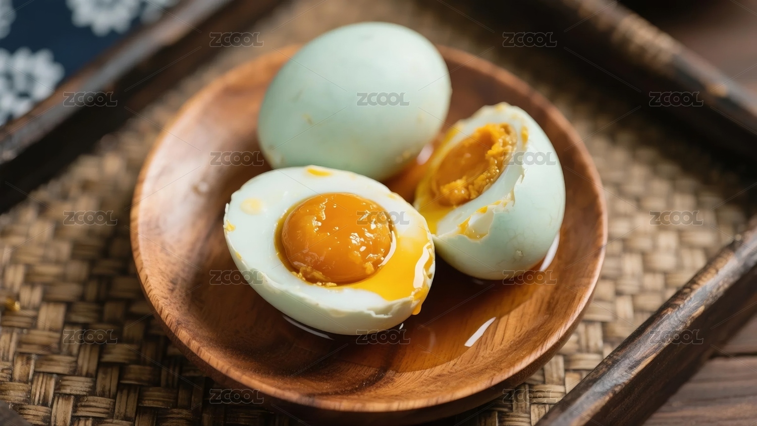 放在竹篮里的切开的中国特色食物咸鸭蛋