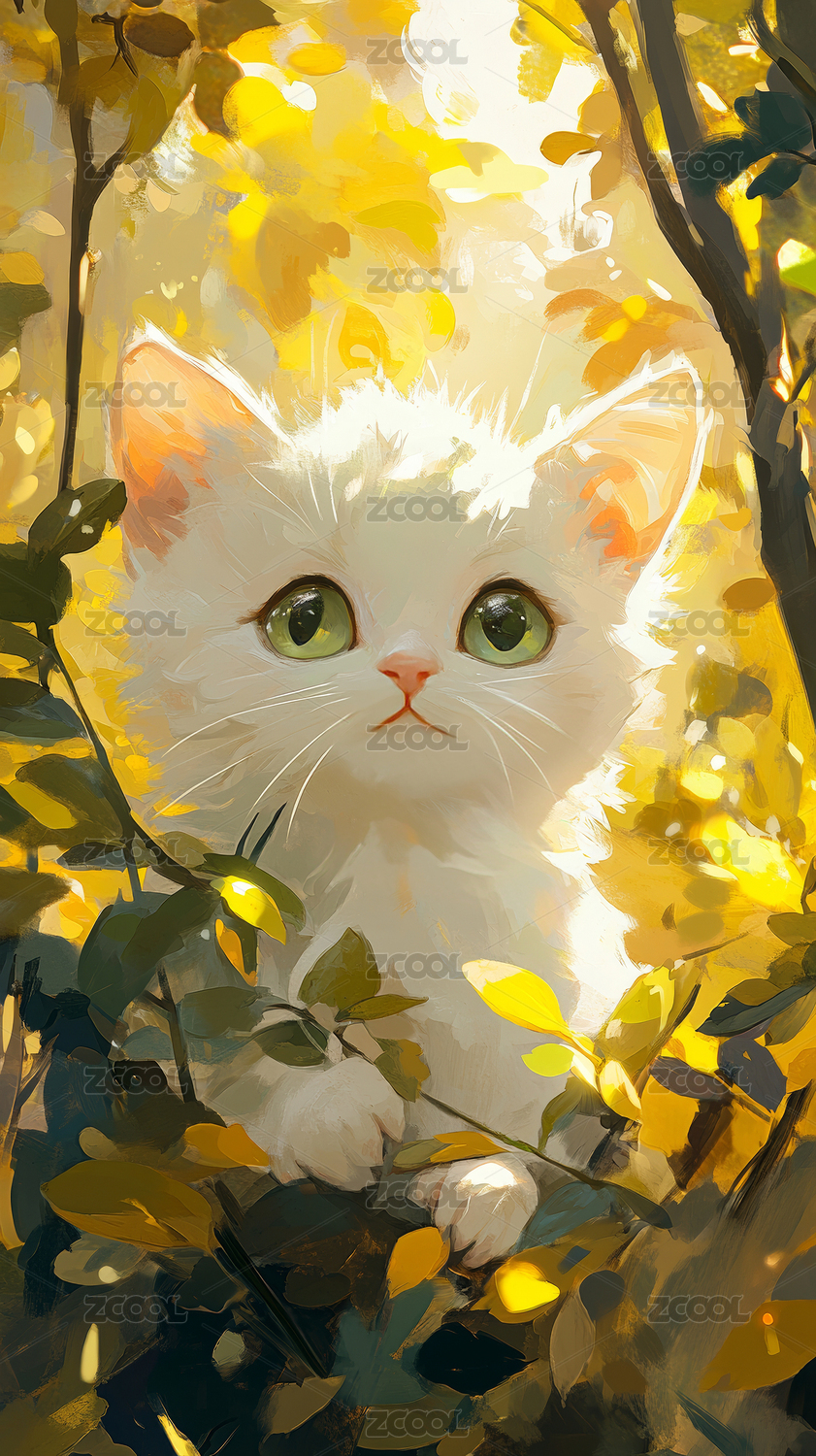 萌猫绿叶间嬉戏水彩风唯美