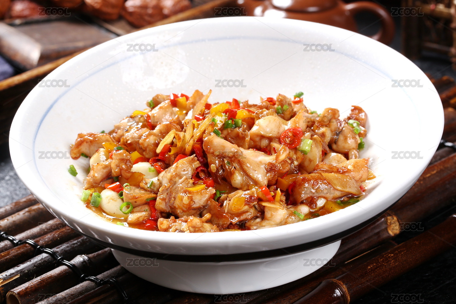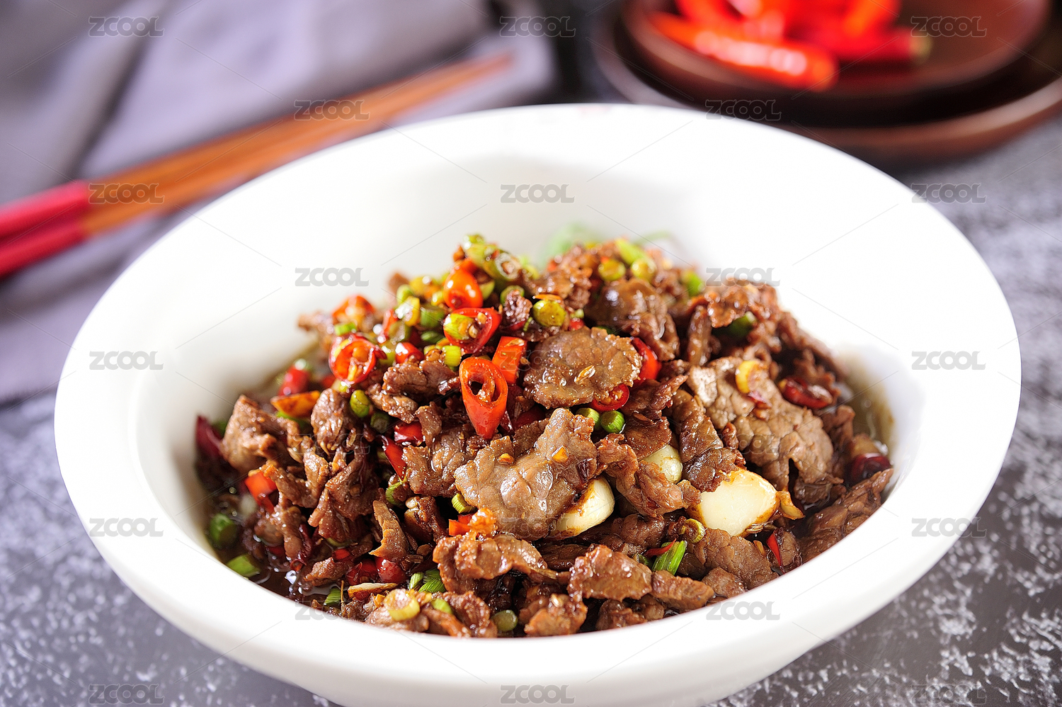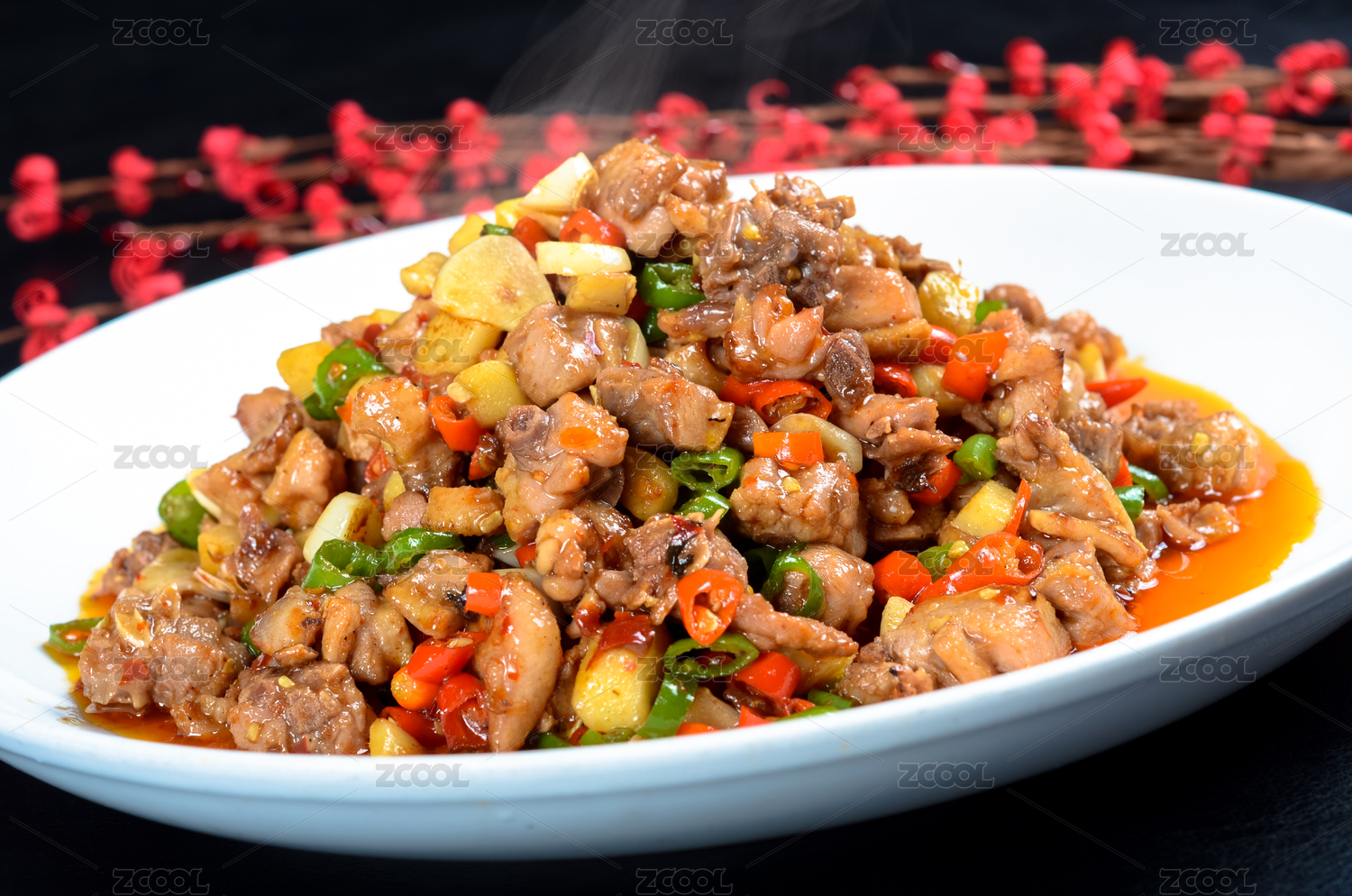 白色瓷盘中的农家小炒肉,暗色背景上有些绿色植物