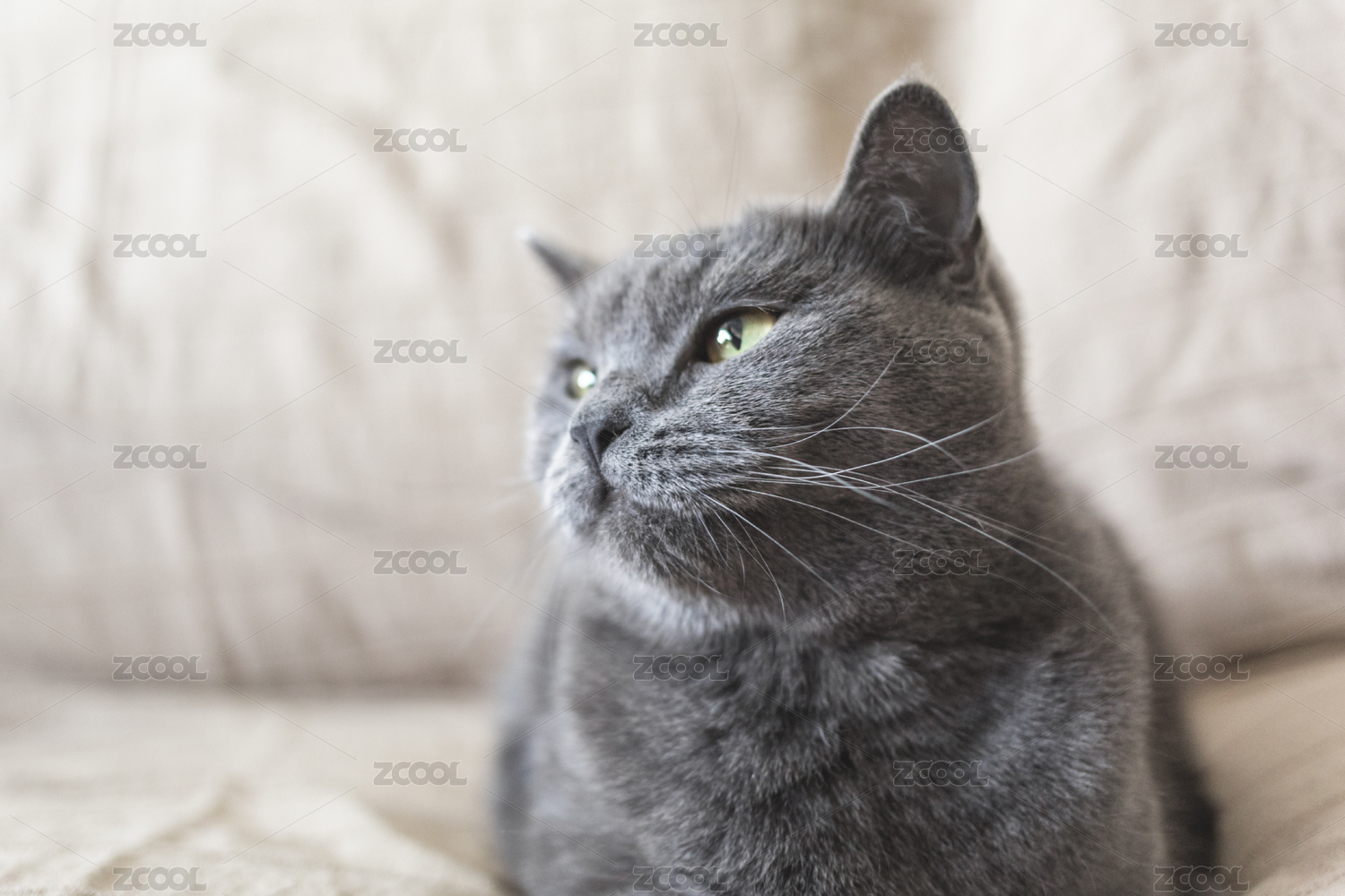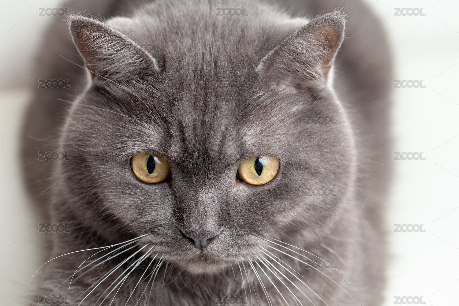 猫,毛茸茸,蓝猫,趴着,严肃,表情,橙色,眼睛,趣味,拟人