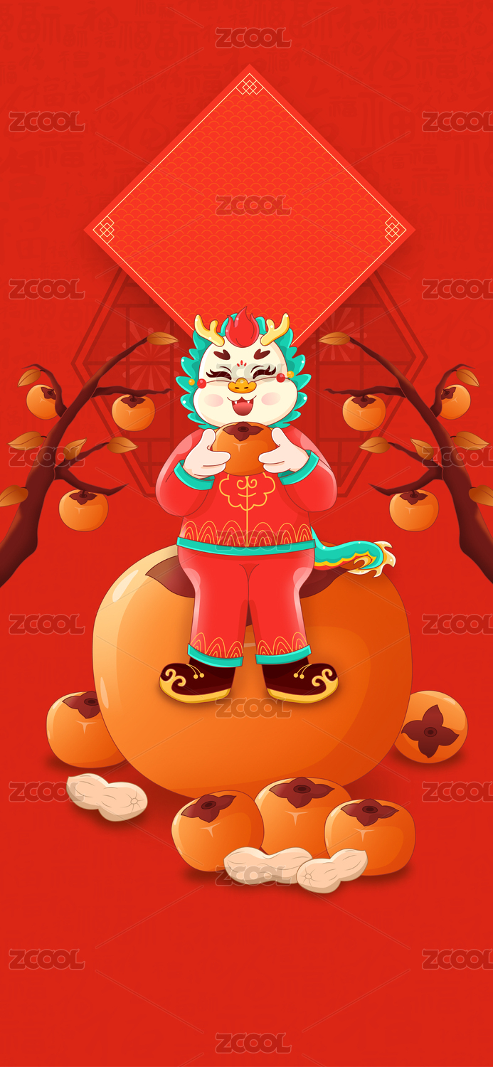 国潮风新年龙年一只龙手拿柿子和柿子树等