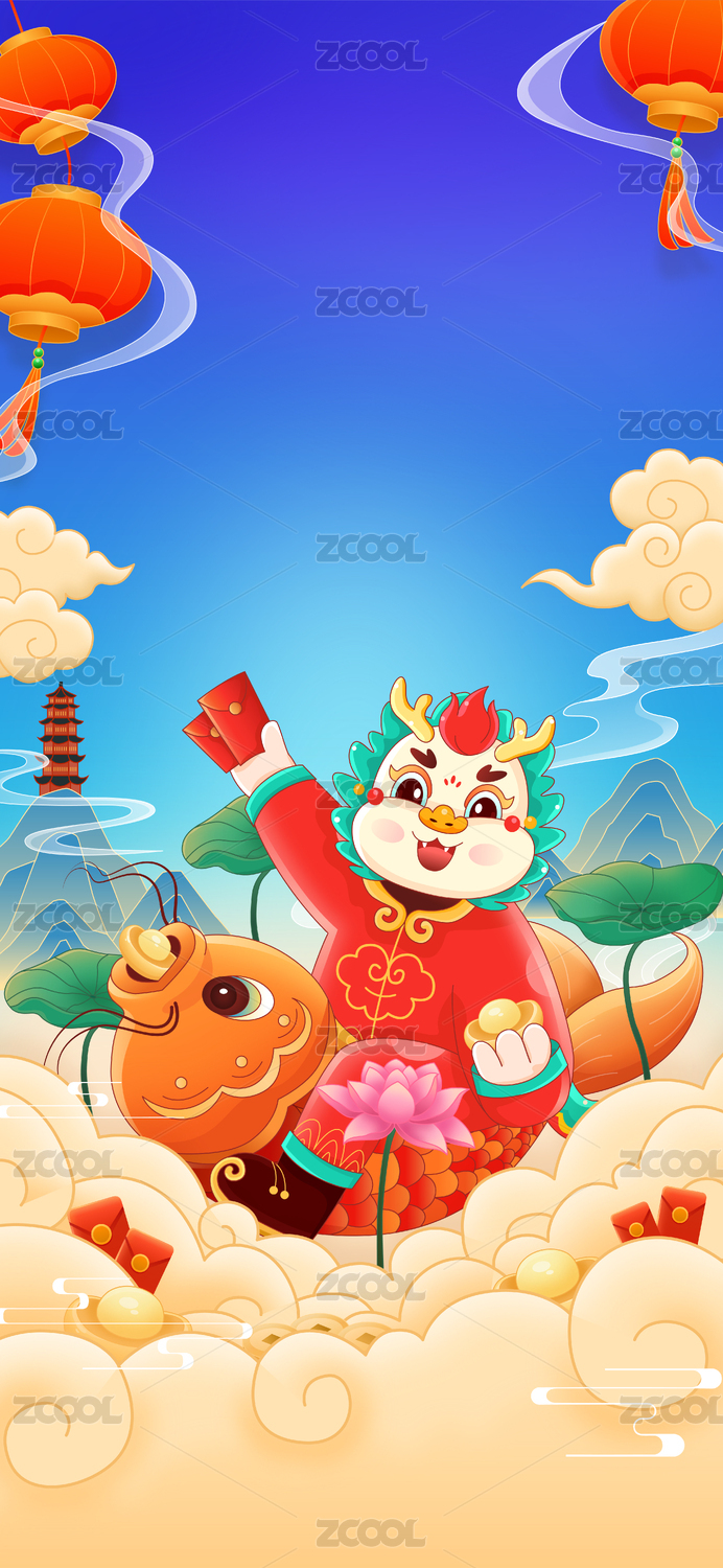国潮风新年一只龙坐在锦鲤上手里拿着红包等