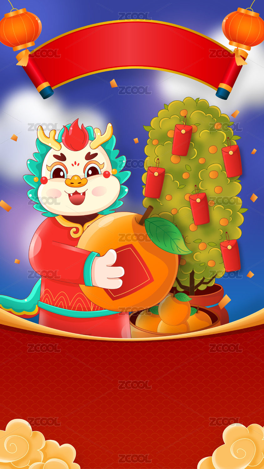 国潮风新年龙年一只龙抱着桔子和橘子树等