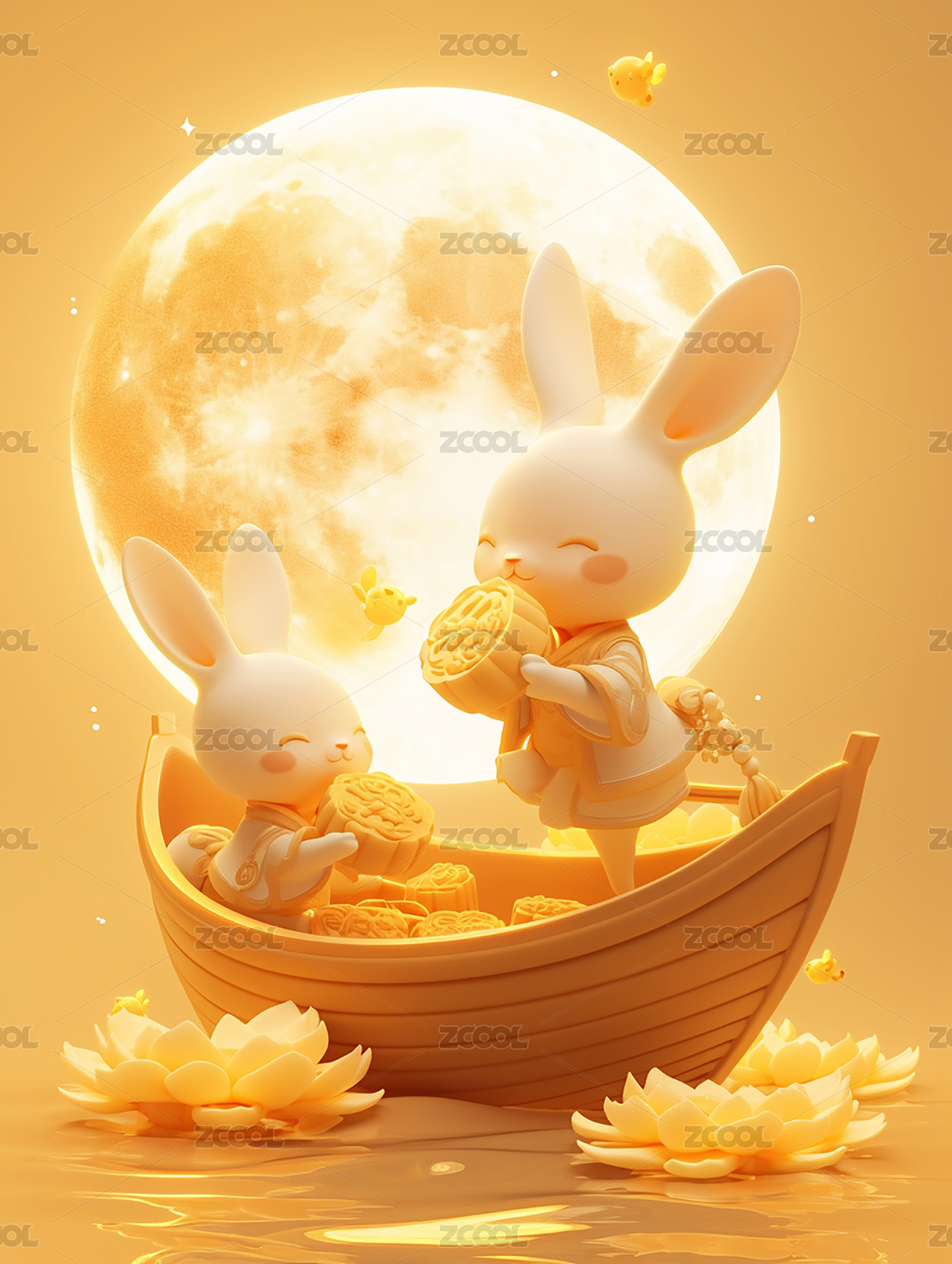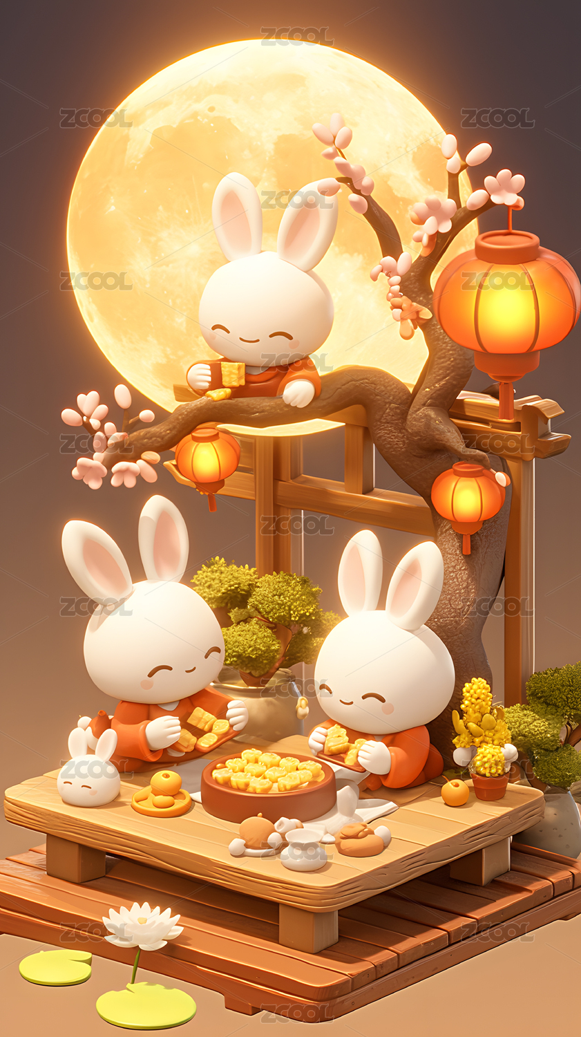 兔子,小白兔,月饼,月亮,中秋,中秋节,卡通,可爱,AIGC202403