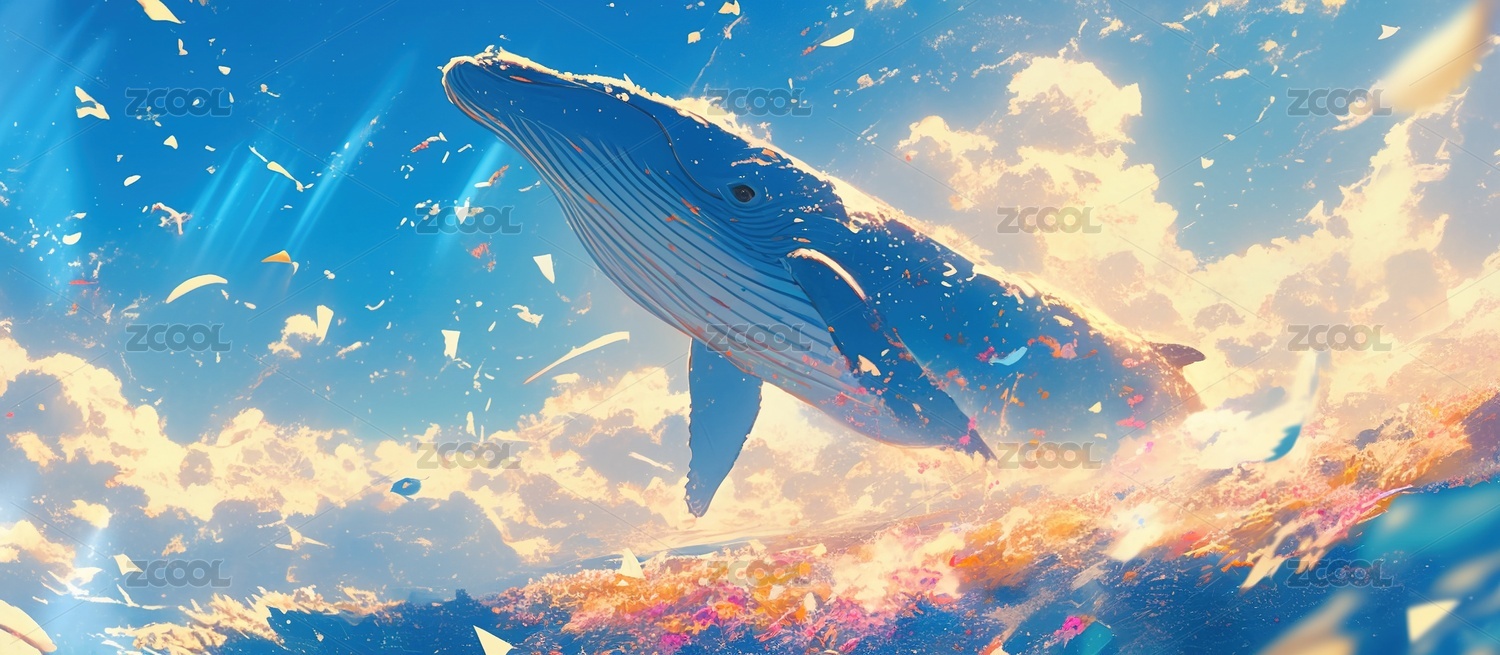 一只巨大的白鲸在深蓝到浅蓝的天空背景