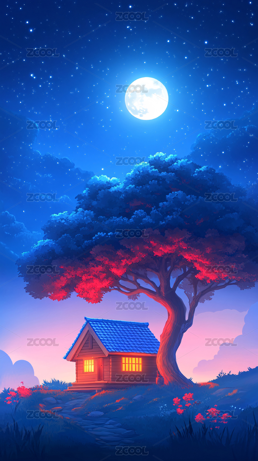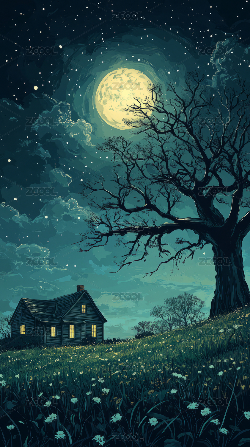 房屋,风景,月亮,插画,绘画,星空,夜晚,住宅,秋景,温馨