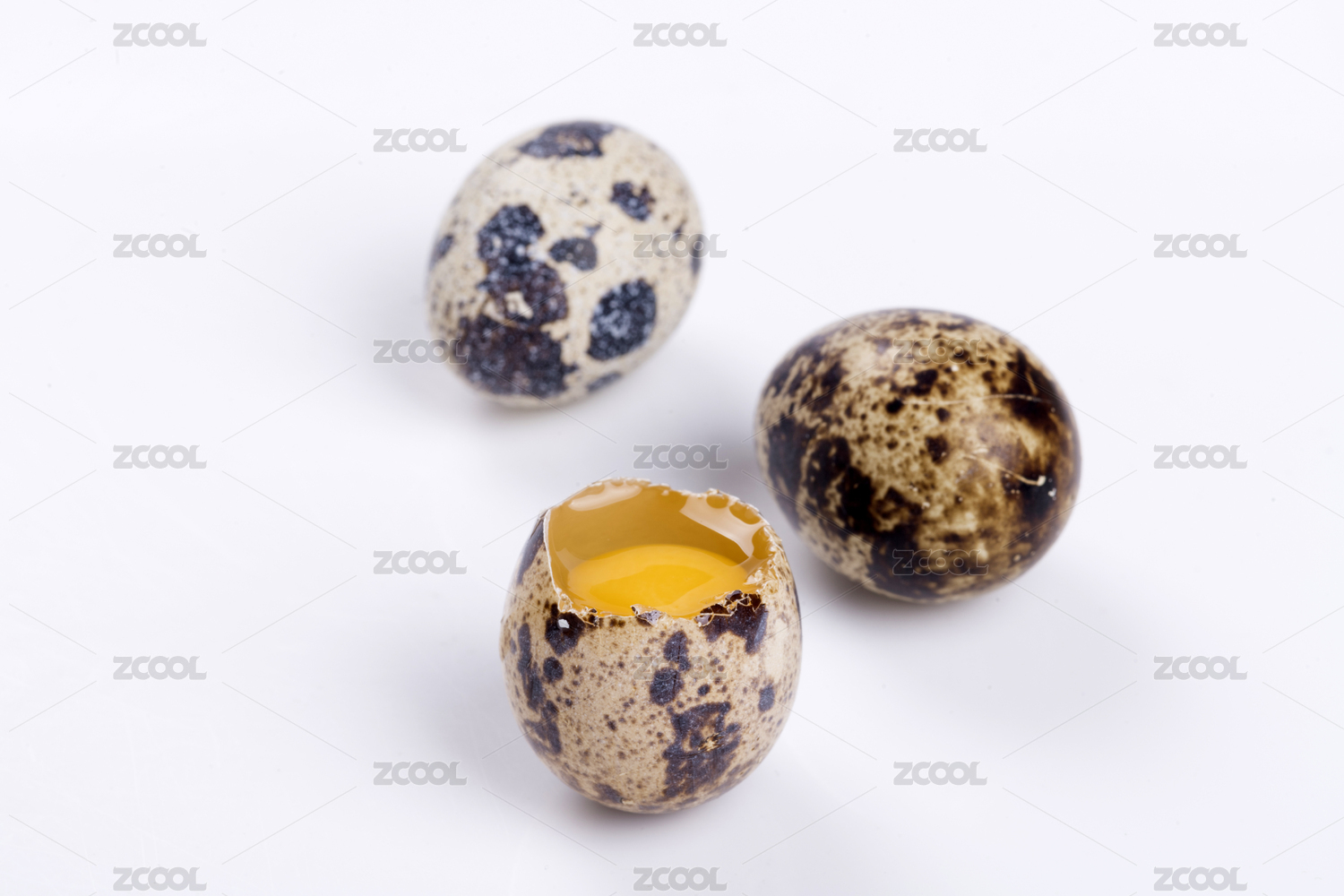 放白背景上的新鲜鹌鹑蛋其中有一个漏出蛋黄