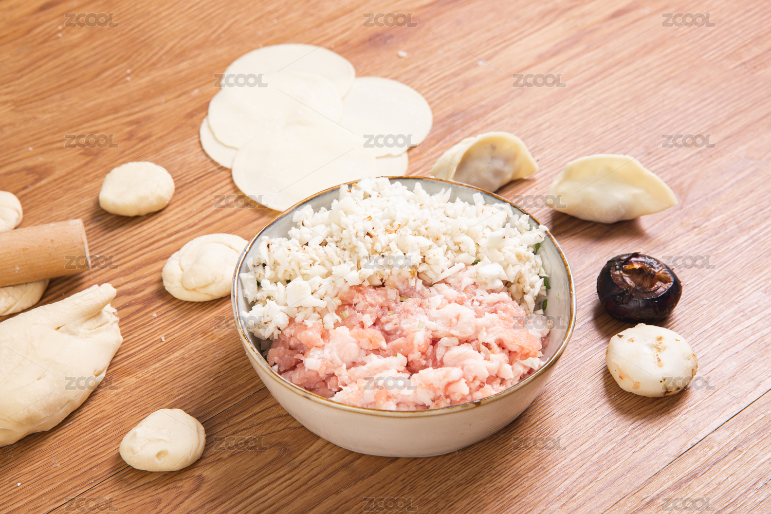 桌上放有一碗香菇猪肉饺子馅和饺子皮