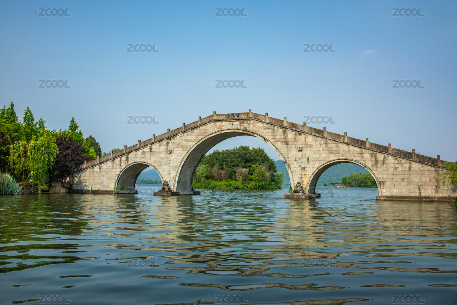 中国江苏南京蓝天河流中有拱形桥孔的中式石拱桥