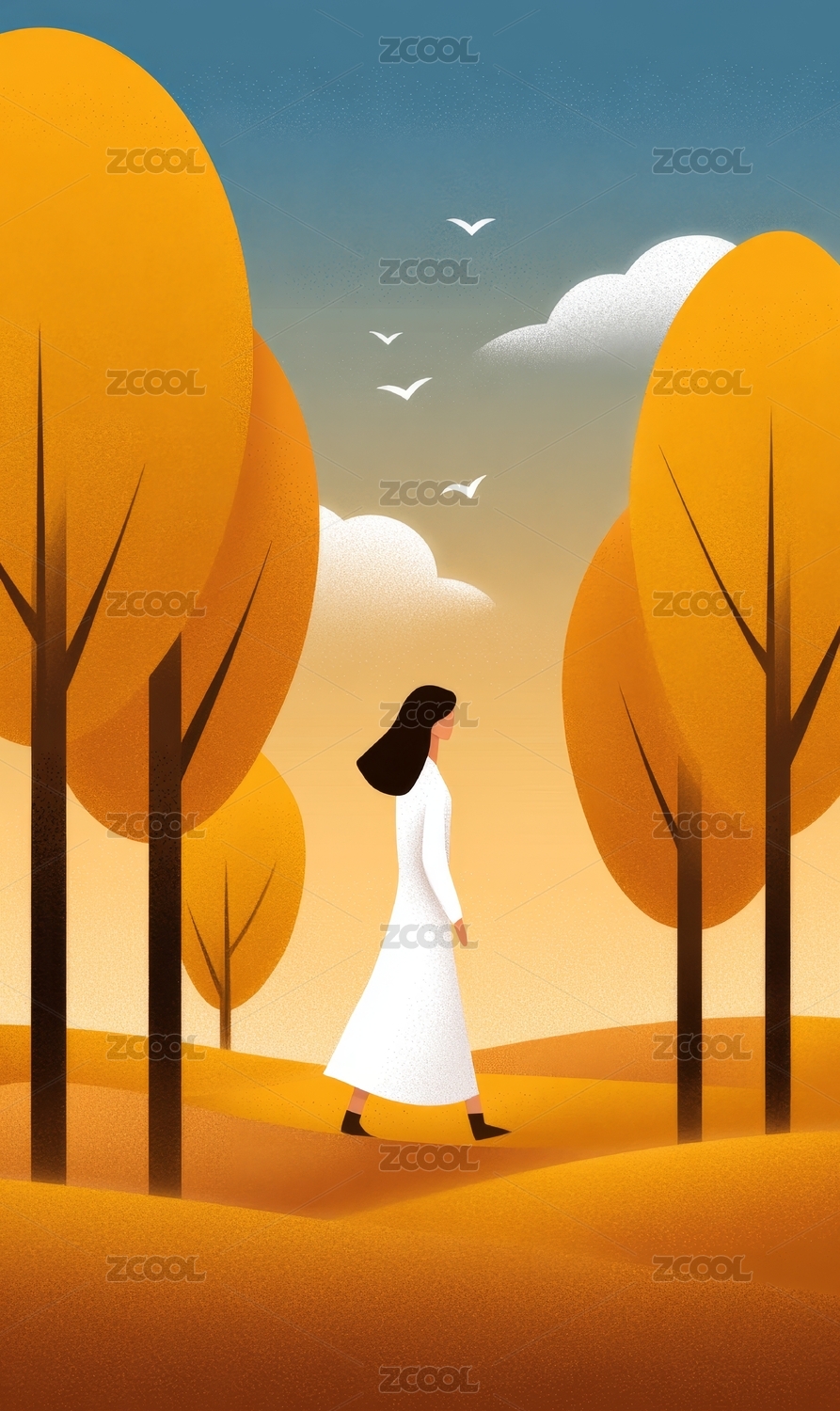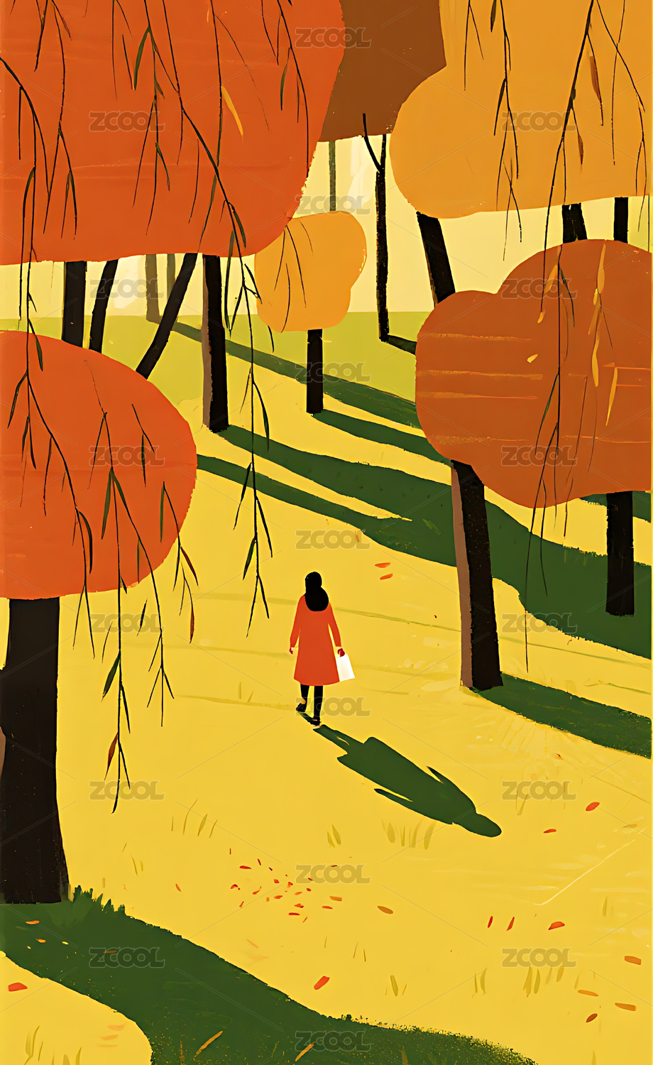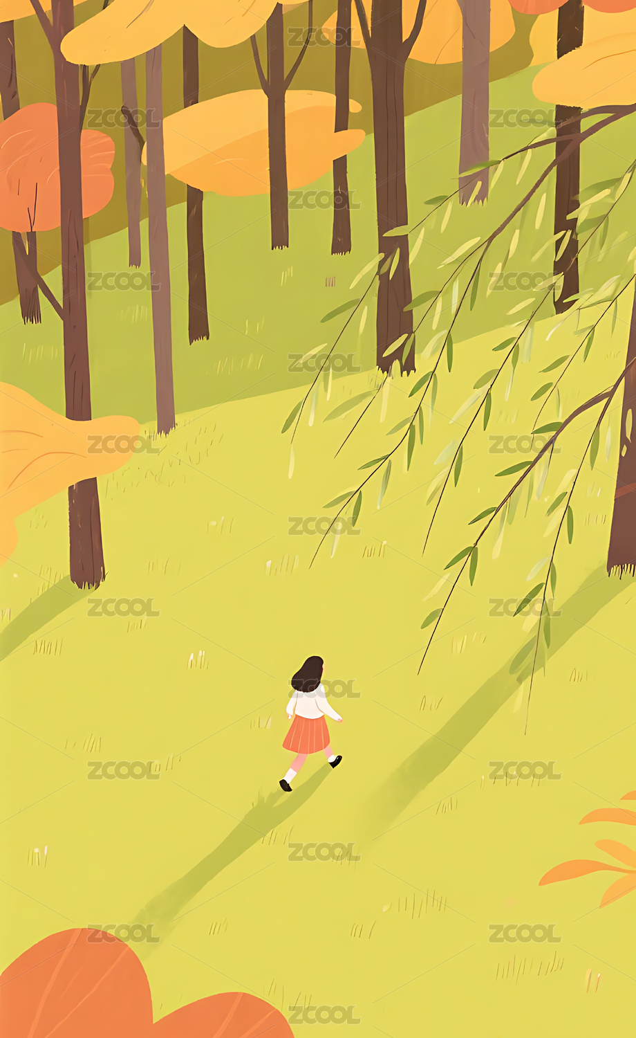 森林,小路,秋季,秋分,立秋,女孩,背景,平面,插画,植物