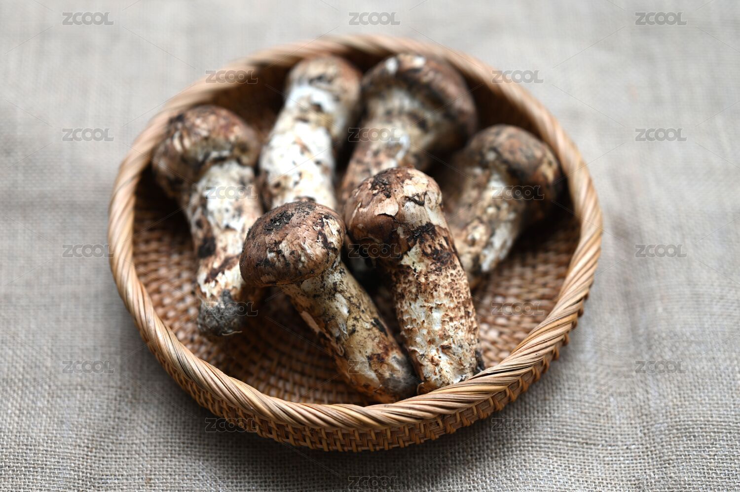 装在小竹编篮子里的新鲜松茸