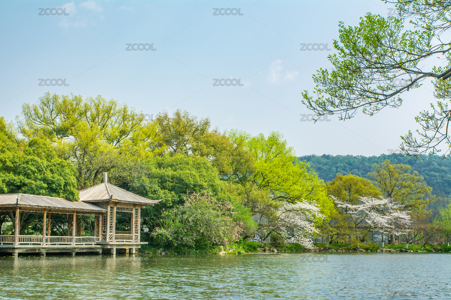 浙江杭州西湖畔樱花盛开的江南园林春景
