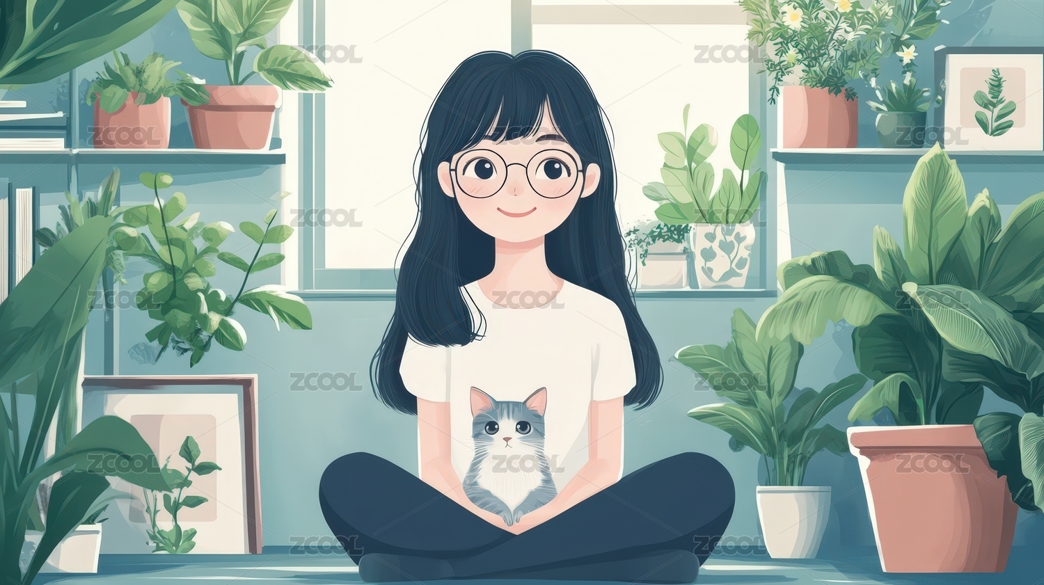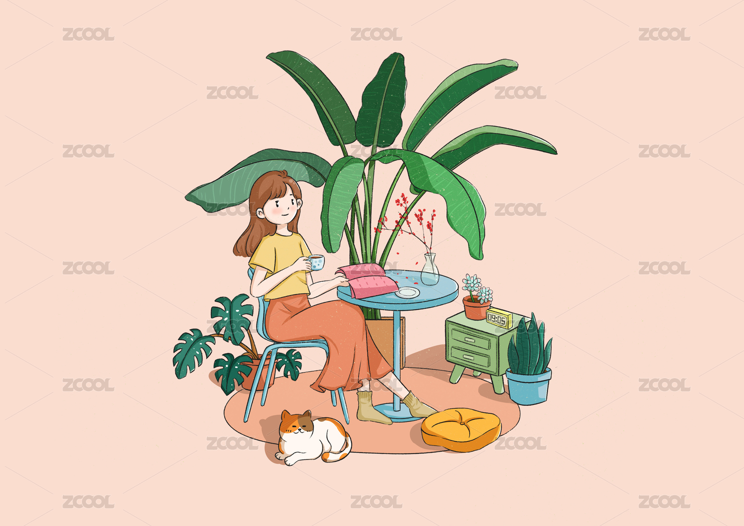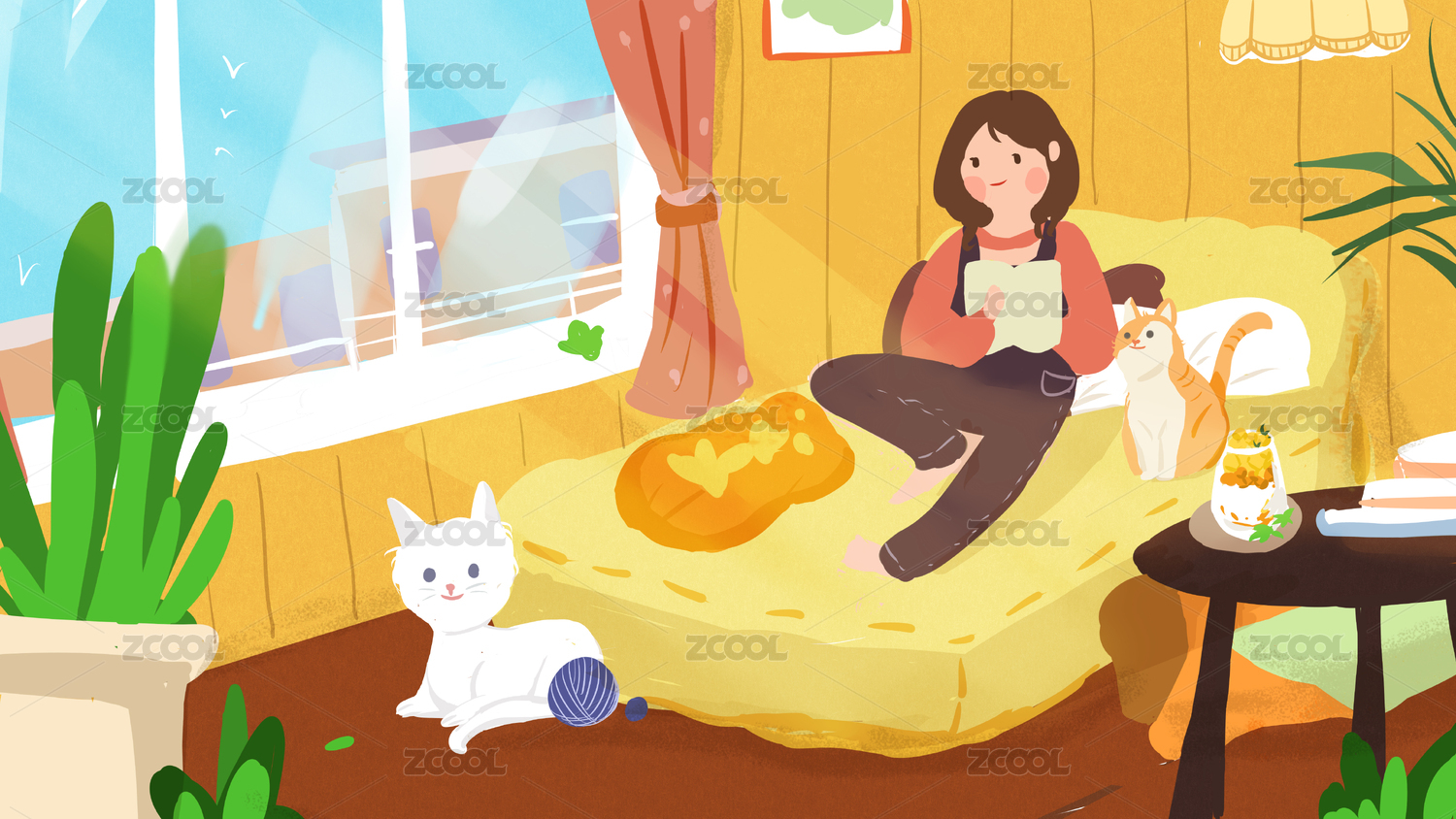 小清新居家生活撸猫喂猫吃马卡龙的女孩插画